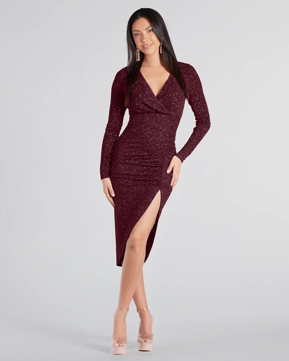 ADDYVERO V-Neck Long Sleeve Lurex Gliter Solid Front Slit Front Ruched Seam Bodycon Above Knee Length Women Dress by VintaVool