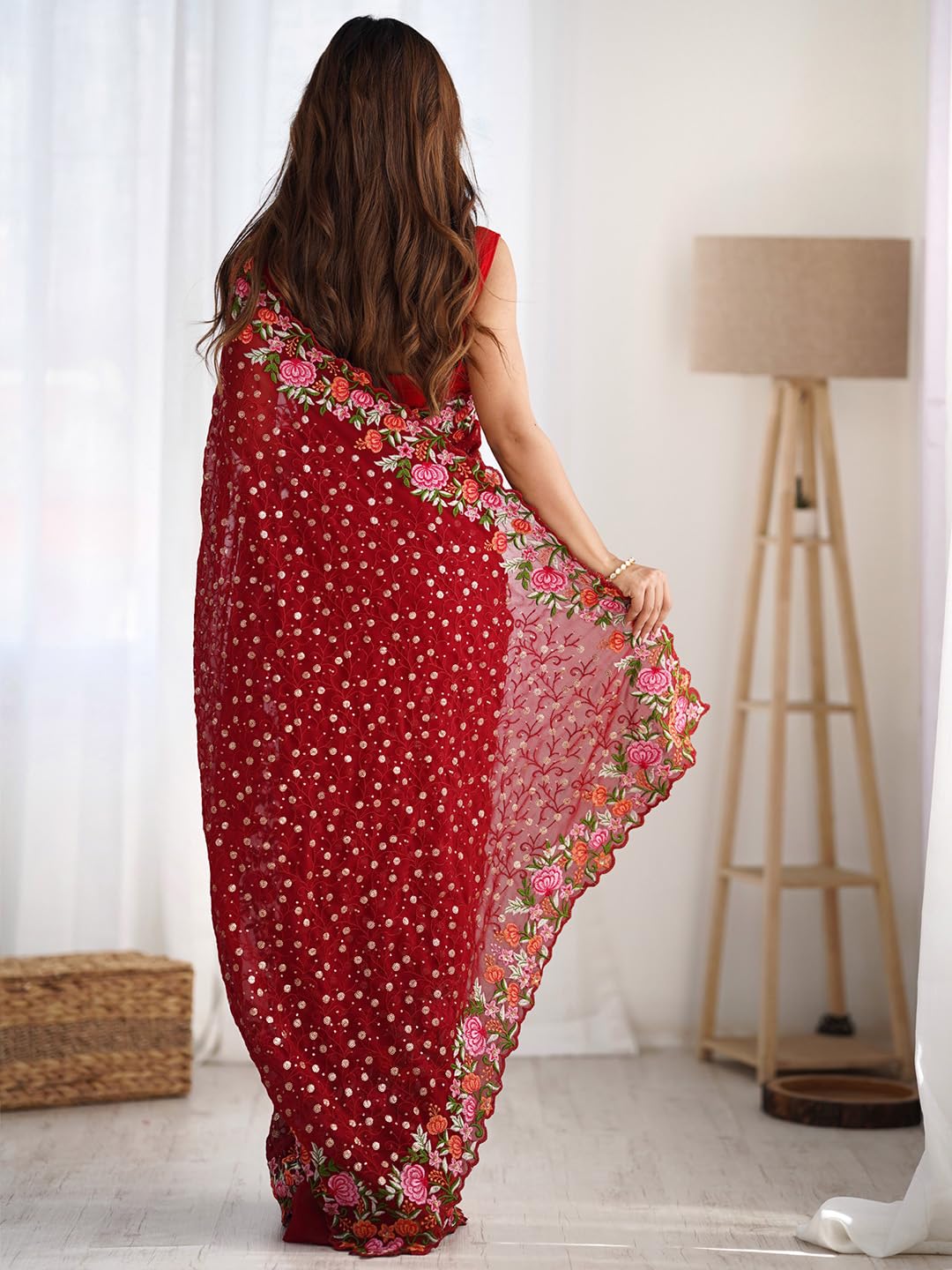 AKHILAM Women’s And Girls Embroidery Lace & Sequence Embroidery Chiffon Saree With Unstitched Blouse Piece by VintaVool
