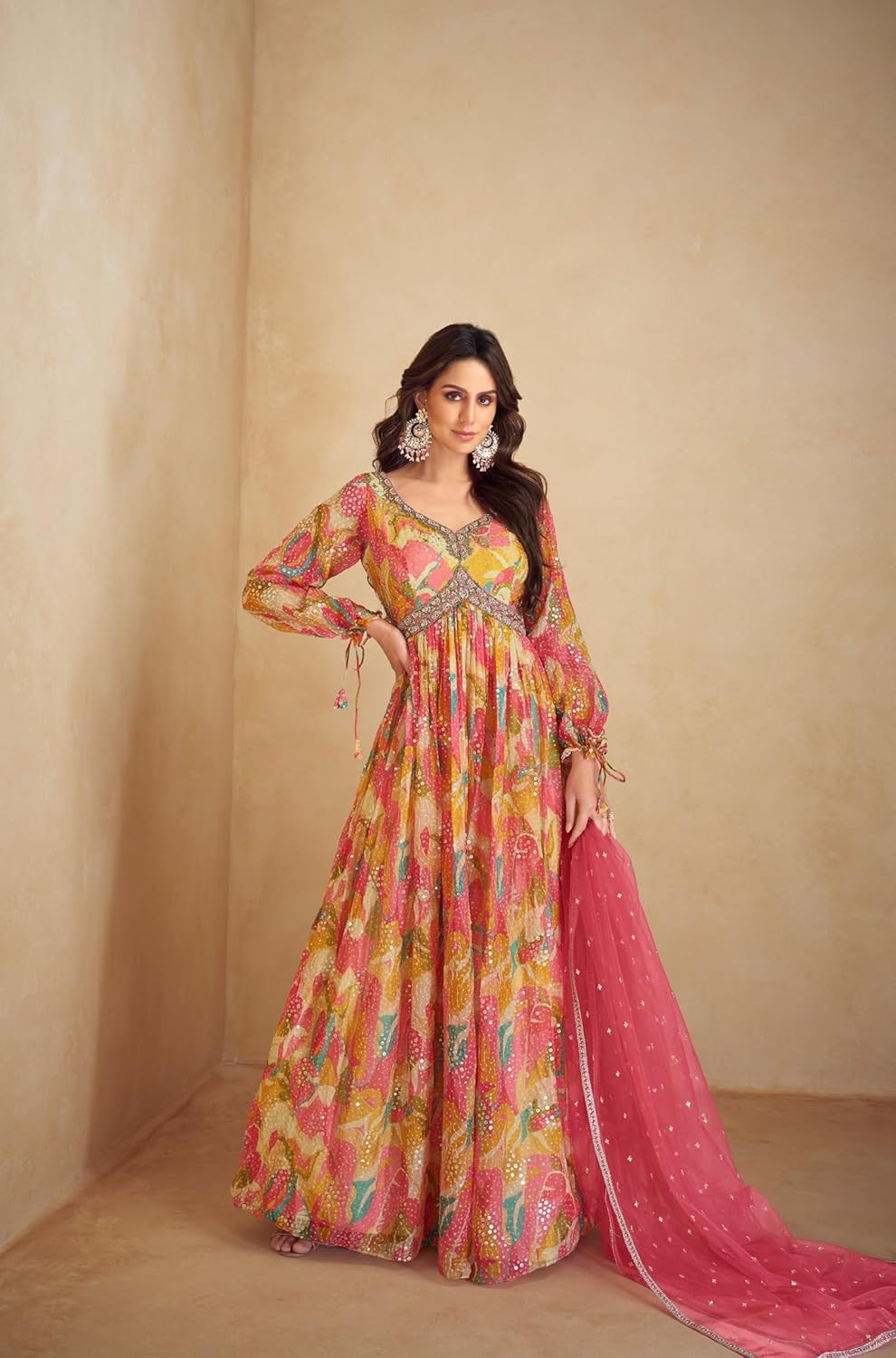 Madhuram Women’s Chinon Chiffon Traditional Ethnic Long Western Dress with Embroidery Work Long Kurta(M-2361) by VintaVool