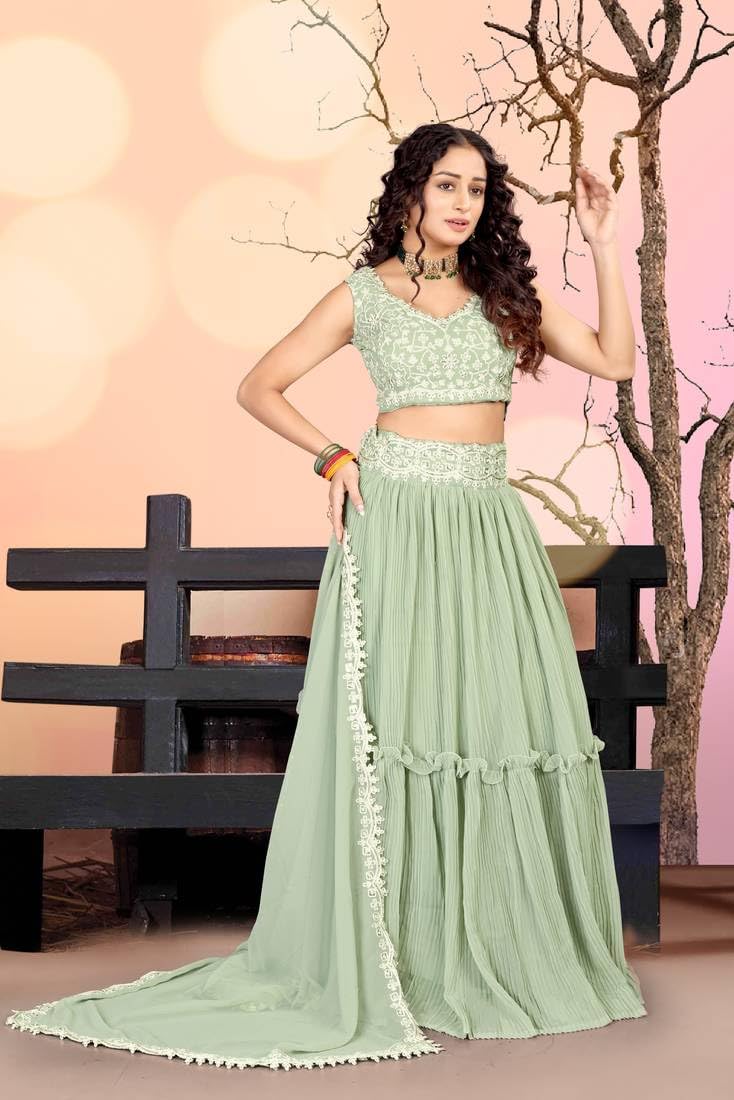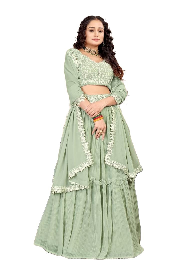 Faux Georgette Omkar Textile’s Sea Green Color Readymade Lehenga Choli With Dupatta Set For Women For Party, Wedding, Festive, Free Size by VintaVool