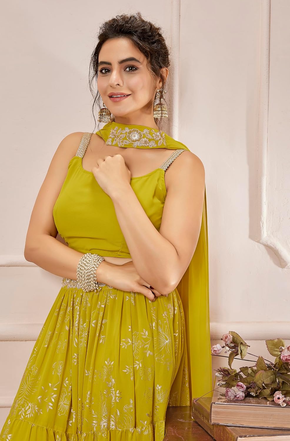 Janasya Women’s Yellow Georgette Embellished Foil Printed Tiered Ready To Wear Lehenga Choli Set by VintaVool