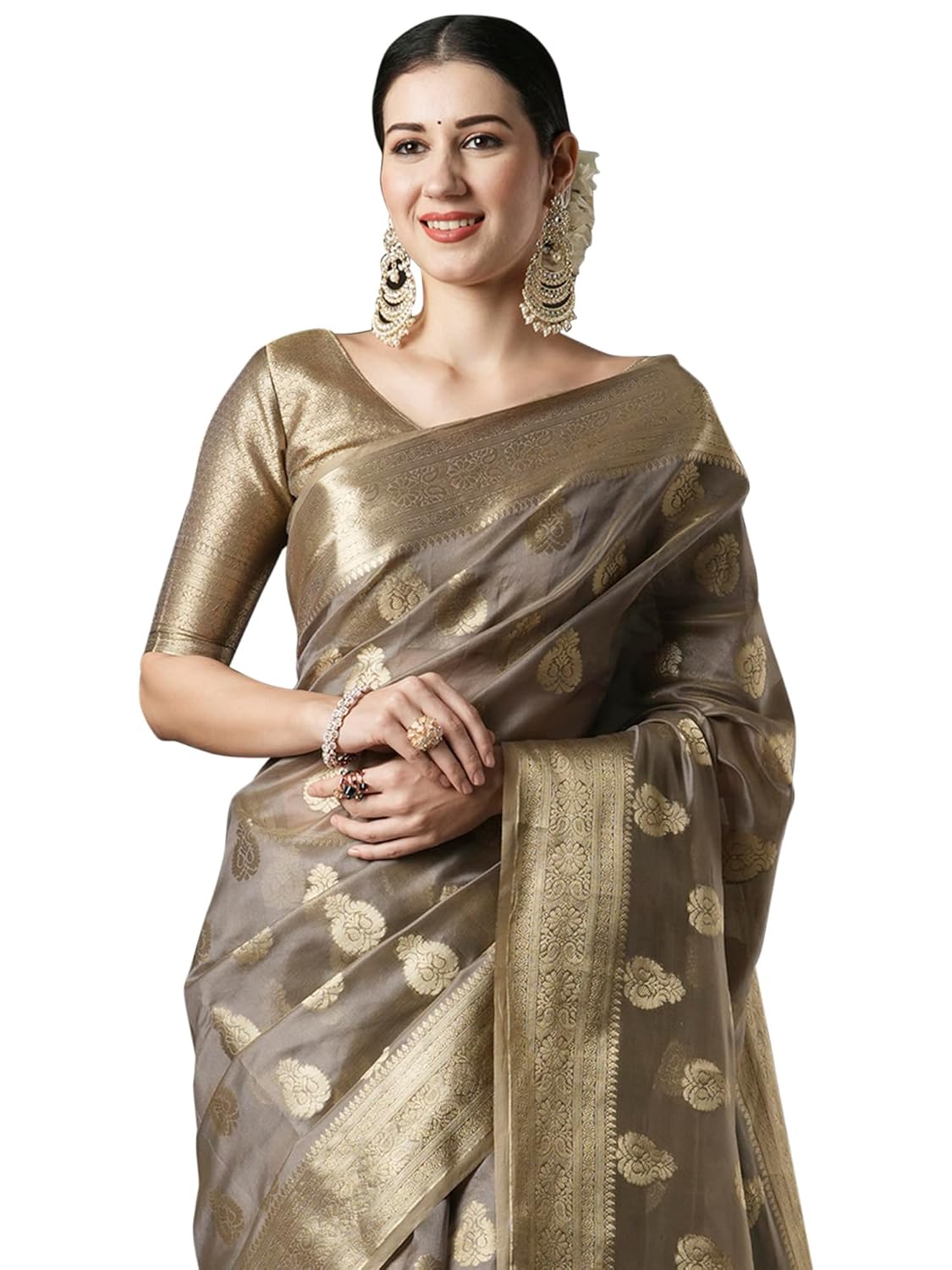 AKHILAM Women’s Organza Ethnic Motif Woven Design Saree With Unstitched Blouse Piece(UNATI3001_AC_Parent) by VintaVool