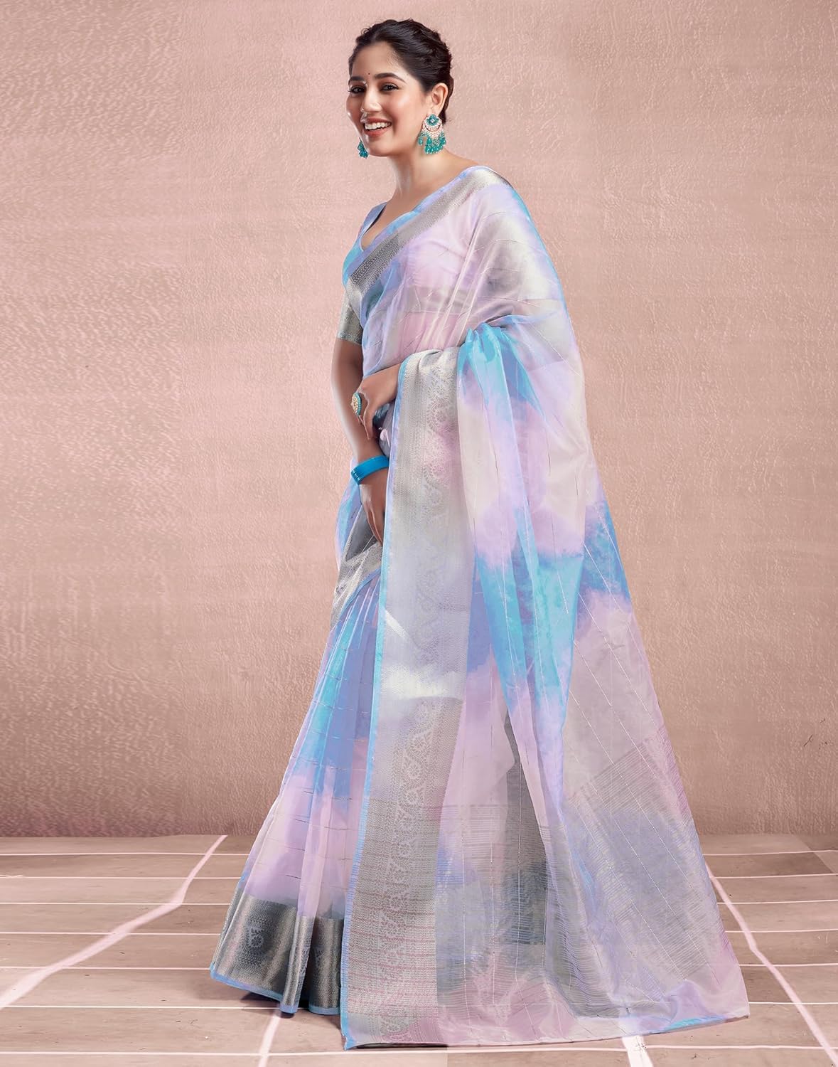 SIRIL Women’s Organza Jacquard Stripe Saree With Unstitched Blouse Piece by VintaVool