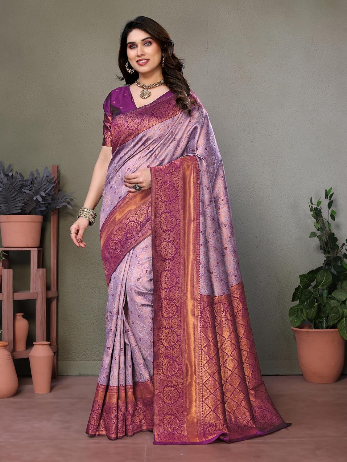 AKHILAM Women’s Woven Design Solid Georgette Kanjeevaram Saree With Unstiched Blouse Piece by VintaVool