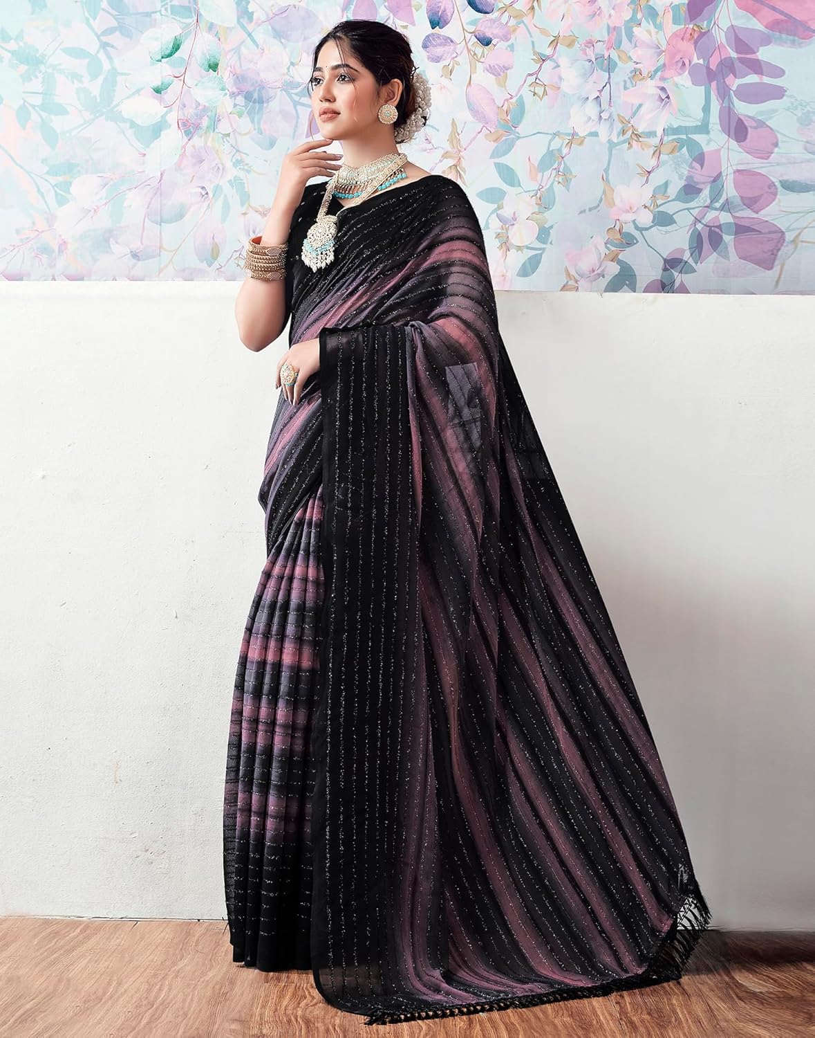 SIRIL Women’s Georgette Printed Zari Striped One Minute Saree Ready to Wear With Unstitched Blouse Piece by VintaVool