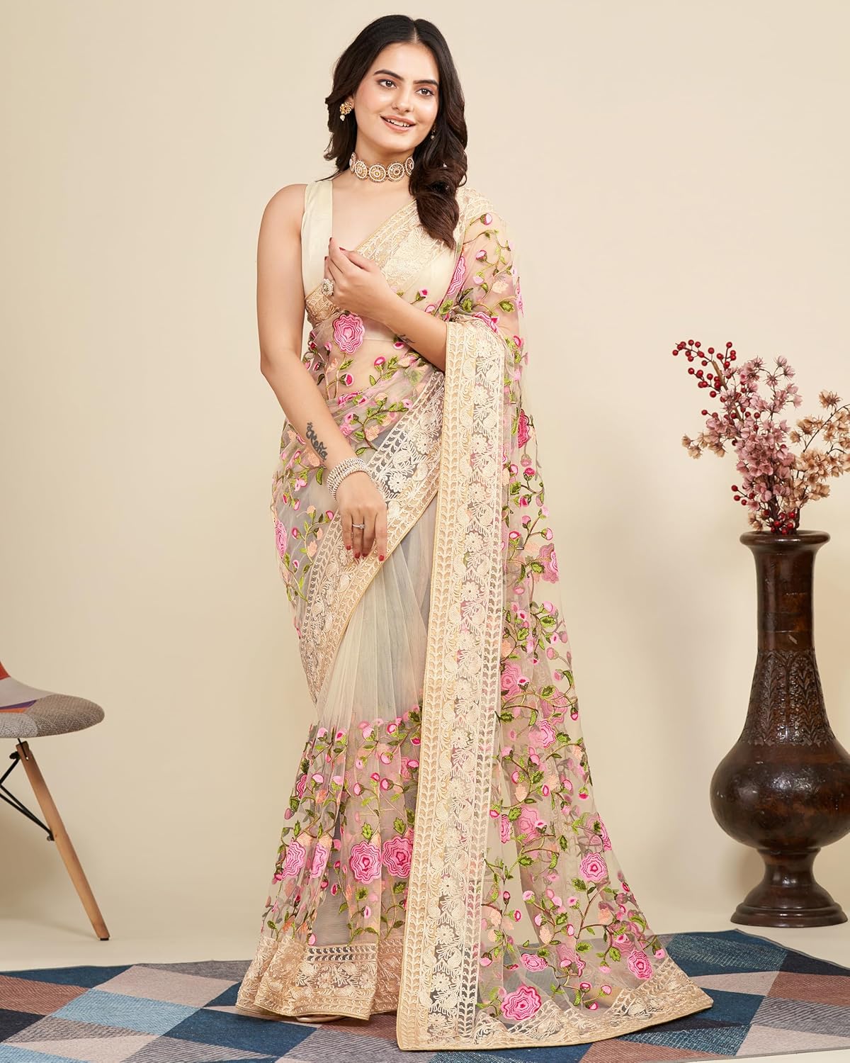 VAIRAGEE Women’s Beautiful Soft Net Embroidery Saree With Unstitched Blouse 6079 by VintaVool