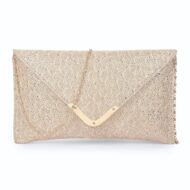 Formal party clutch with gold metal fitting on the flap, made in PVC/PU with magnetic closure.