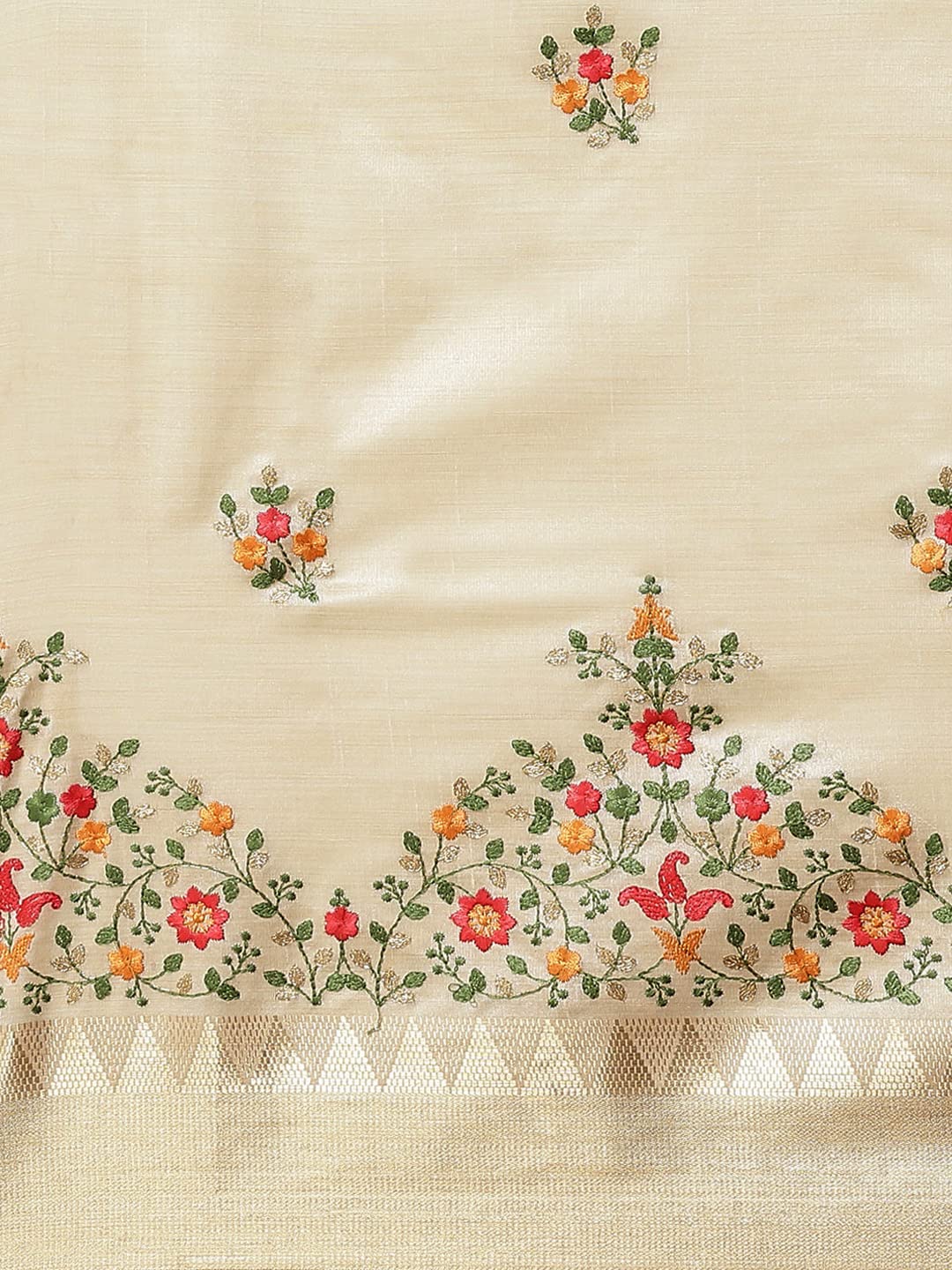 Saree fabric : Assam cotton Silk. Blouse fabric Assam cotton Silk.Work : Multi color thread embroidered Saree With Golden Zari And Temple Contrast border Length : 5.5 Mtr Blouse Length : 0.8 Mtr UnStitched Blouse Type : Party/Festive/Wedding Wear Saree