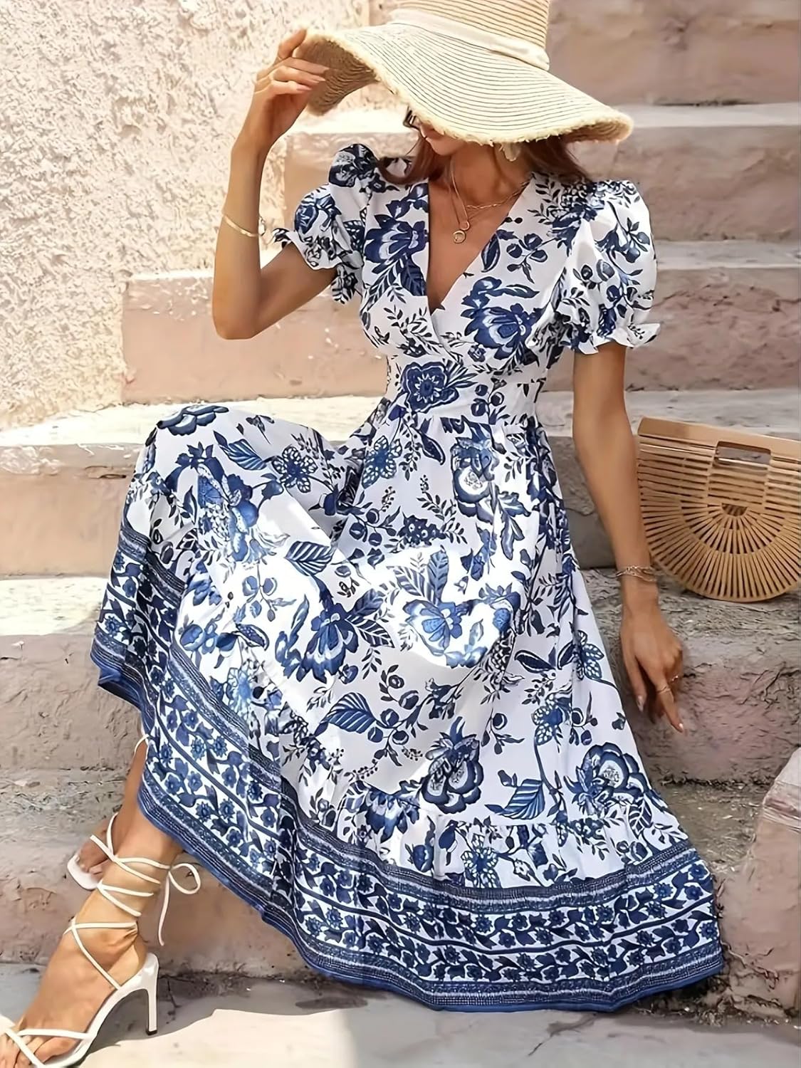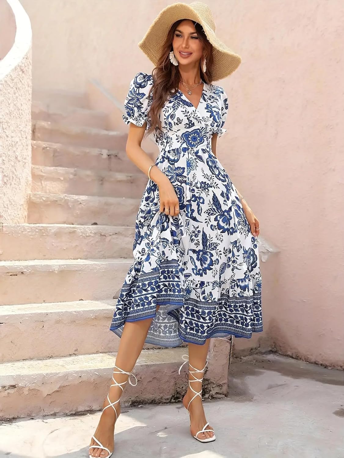 Make a stunning statement in this enchanting midi dress featuring a mesmerising blue and white porcelain-inspired floral print. The elegant V-neckline and charming puff sleeves add a romantic touch to this summer-perfect ensemble. The dress showcases an intricate border pattern along the hemline that beautifully complements the all-over floral motif. With its flattering silhouette and graceful midi length, this dress creates a sophisticated yet breezy look. The puff sleeves provide just the right amount of drama, whilst the fitted waist highlights your natural curves. Perfect for garden parties, afternoon soirées, or any special summer occasion. The versatile blue and white colour palette offers endless styling possibilities – pair it with neutral accessories to let the dress take centre stage. The lightweight fabric ensures comfort throughout the day, making it an ideal choice for warm-weather occasions.