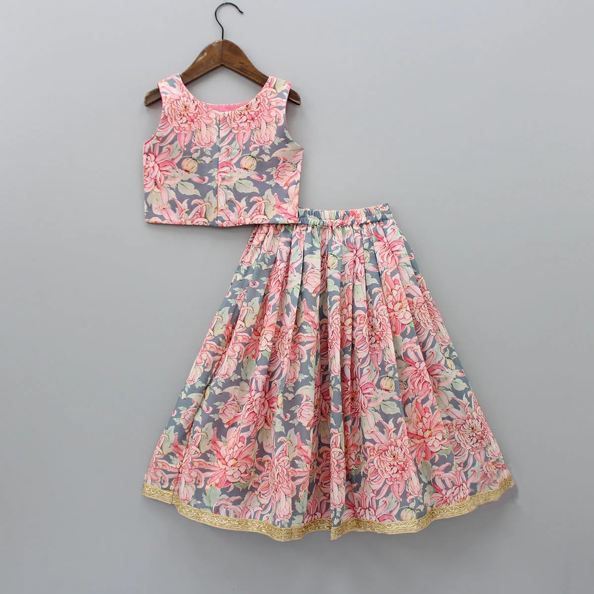 This beautiful rayon lehenga choli set makes a statement with its large pink floral print. Crafted from lightweight and breathable rayon fabric, this lehenga set is perfect for Indian festivals and celebrations. The flared lehenga has delicate embroidery along the hem and comes with a matching choli and blouse piece. The choli features thin straps and a modest neckline, giving your little girl a graceful look. Measuring sizes 3-14 years, this lehenga set comes in an easy to wear readymade cut with elastic waistband for comfort. Carefully made following Indian textile standards, this ethnic wear set can be hand washed in cold water. Gift your daughter this lovely lehenga set and let her shine at the next family function!