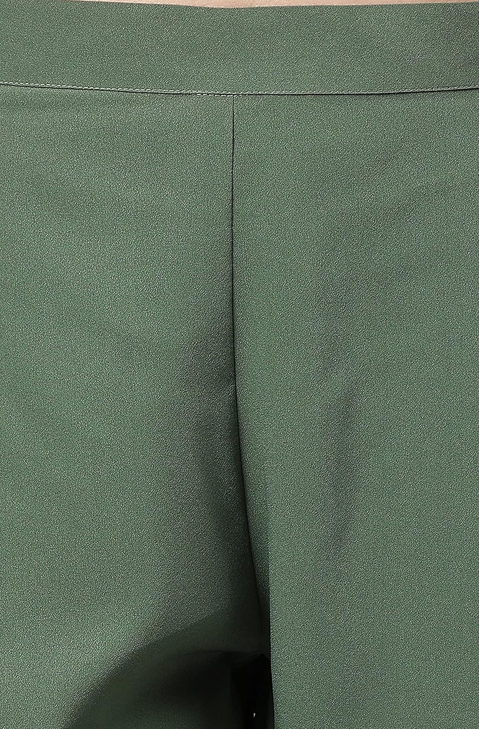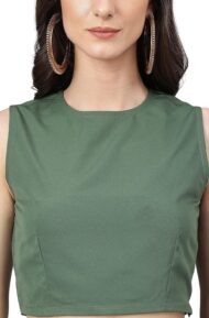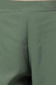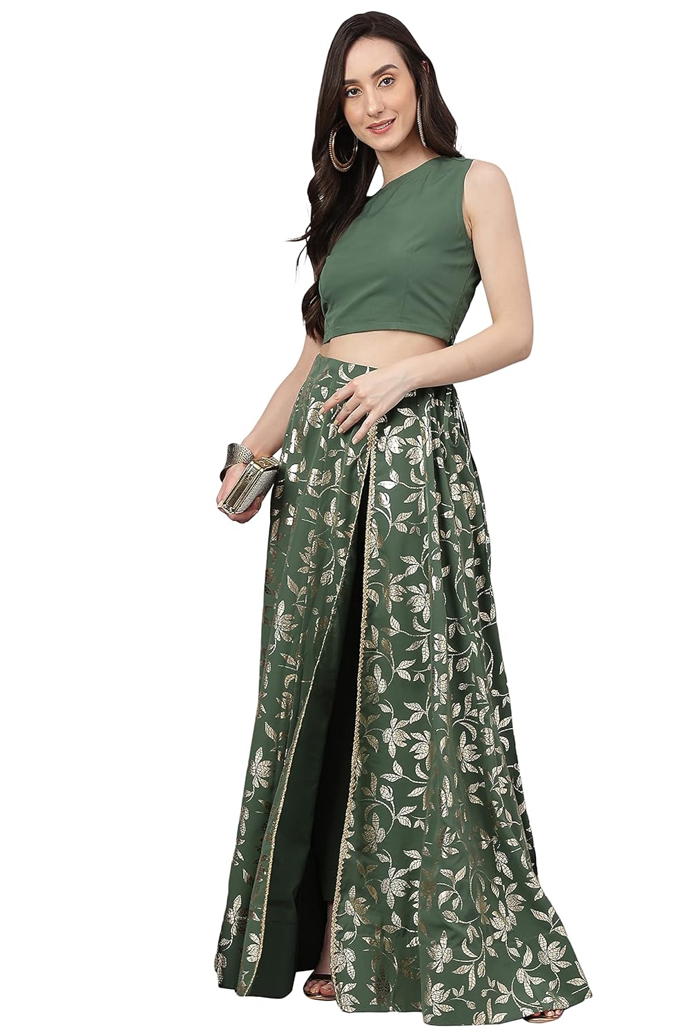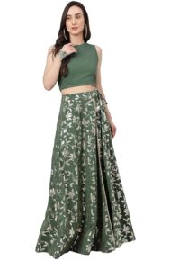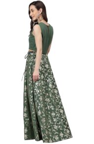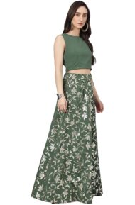 Dress in style in our indo western olive-green crop top lehenga set with pants. The sleeveless crop top is crafted in crepe fabric paired with solid pants with the foil printed lehenga featuring a high slit adorned with the lace work. The top features button loop opening along with side zipper and the lehenga has drawstrings with the zipper.