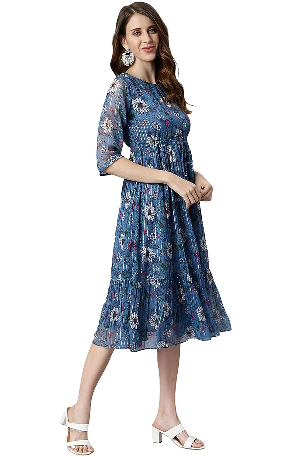 Premium Collection by Janasya. A fusion of style and comfort, this blue poly georgette dress from Janasya will be an apt inclusion to your wardrobe. Featuring a keyhole neck, crepe lining, tie-up at waist with gathers, three quarter sleeves, this gathered hemline dress posseses a stunning taste. Match this dress with a pair of heeled sandals.