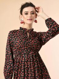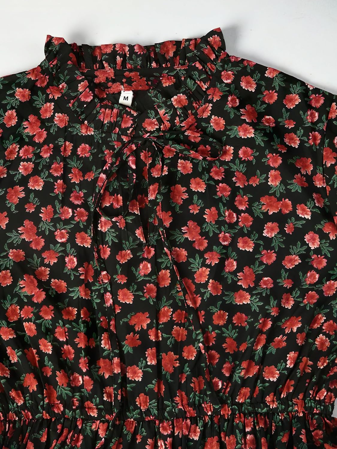 Elevate your style with this stunning floral dress. Crafted from high-quality fabric, it features a beautiful all-over print of vibrant roses and delicate florals against a striking black backdrop. The dress boasts a flattering fit-and-flare silhouette, with a fitted bodice and a flowy dresses that falls gracefully below the knee. The long sleeves and tie neckline add a touch of elegance, while the lightweight material ensures comfort throughout the day. Perfect for any occasion, this dress will make you the centre of attention with its captivating design. Pair it with heels and a clutch for a chic evening look or dress it down with sandals for a casual daytime ensemble. Available in a range of sizes to suit every body type.