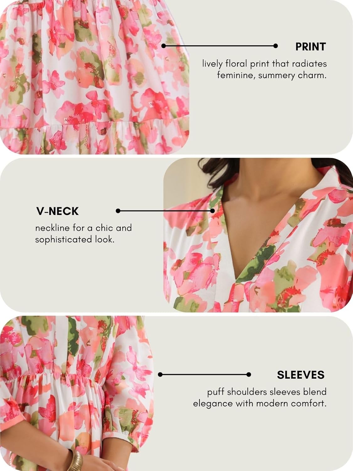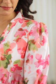 This dress is so beautiful and perfect for summer. The quality of fabric is soft and very comfortable. Length is very nice either short nor too long. Pibk printed dress is must have for this summer season.