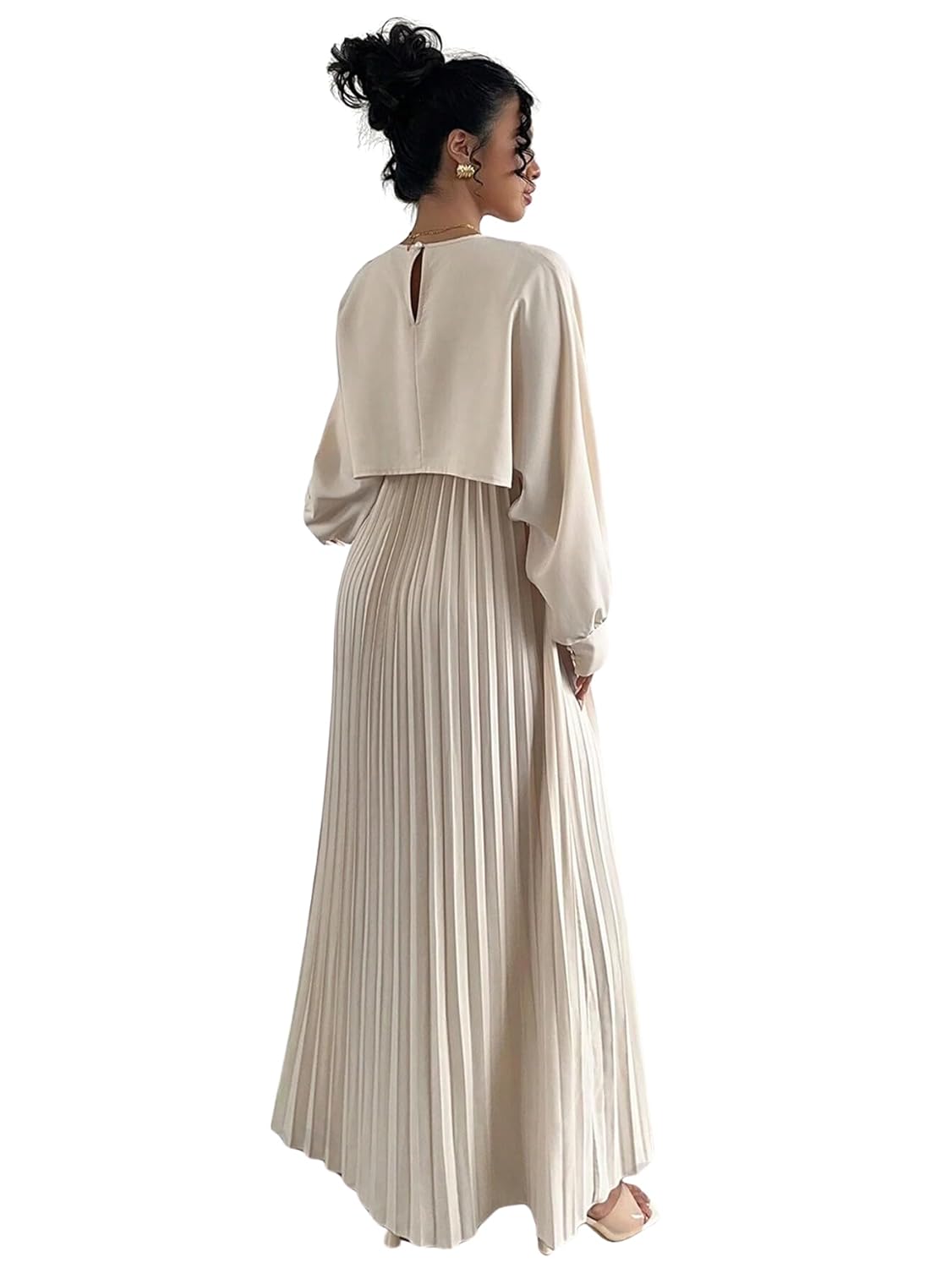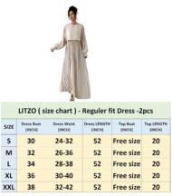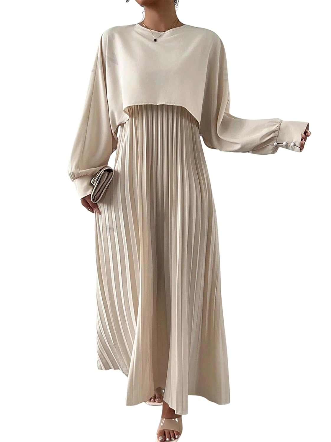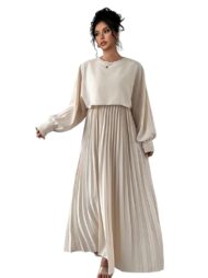 The pleated adds a graceful flow to the silhouette, while the loose, long-sleeved top creates a good look. The soft beige tone gives it a timeless, sophisticated feel perfect for both casual outings and semi-formal events. The design is modest yet stylish, flattering all body types with its relaxed fit and gentle drape. A versatile and refined choice for any fashion forward wardrobe.