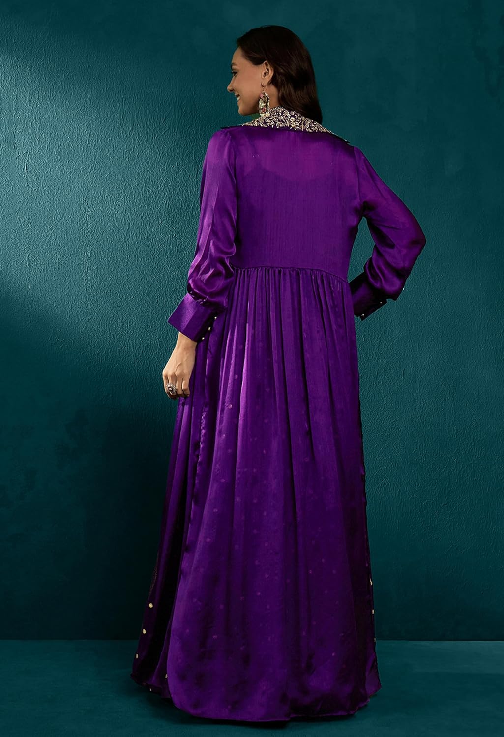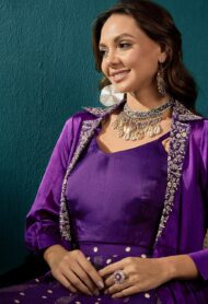 The LYMI LABEL Fusion Set for Women combines traditional elegance with modern flair, offering a stunning ensemble that exudes grace and sophistication. This purple chiffon top is lightweight and airy, providing both comfort and style. The top features delicate fabric that flows beautifully, complementing the intricate printed lehenga that brings a touch of vibrancy to the look. The lehenga, designed with intricate patterns and subtle tones, adds a sense of grandeur without being overwhelming. The highlight of the set is the zari sequence embroidered shrug, which gives the outfit a touch of regal refinement with its sparkling threadwork. This shrug beautifully drapes over the top, adding an element of luxury to the overall design. Whether you’re attending a festive occasion, wedding, or a special celebration, this fusion set ensures that you stand out with elegance and charm. The fusion of contemporary and traditional elements allows this set to be versatile, making it suitable for a variety of events.