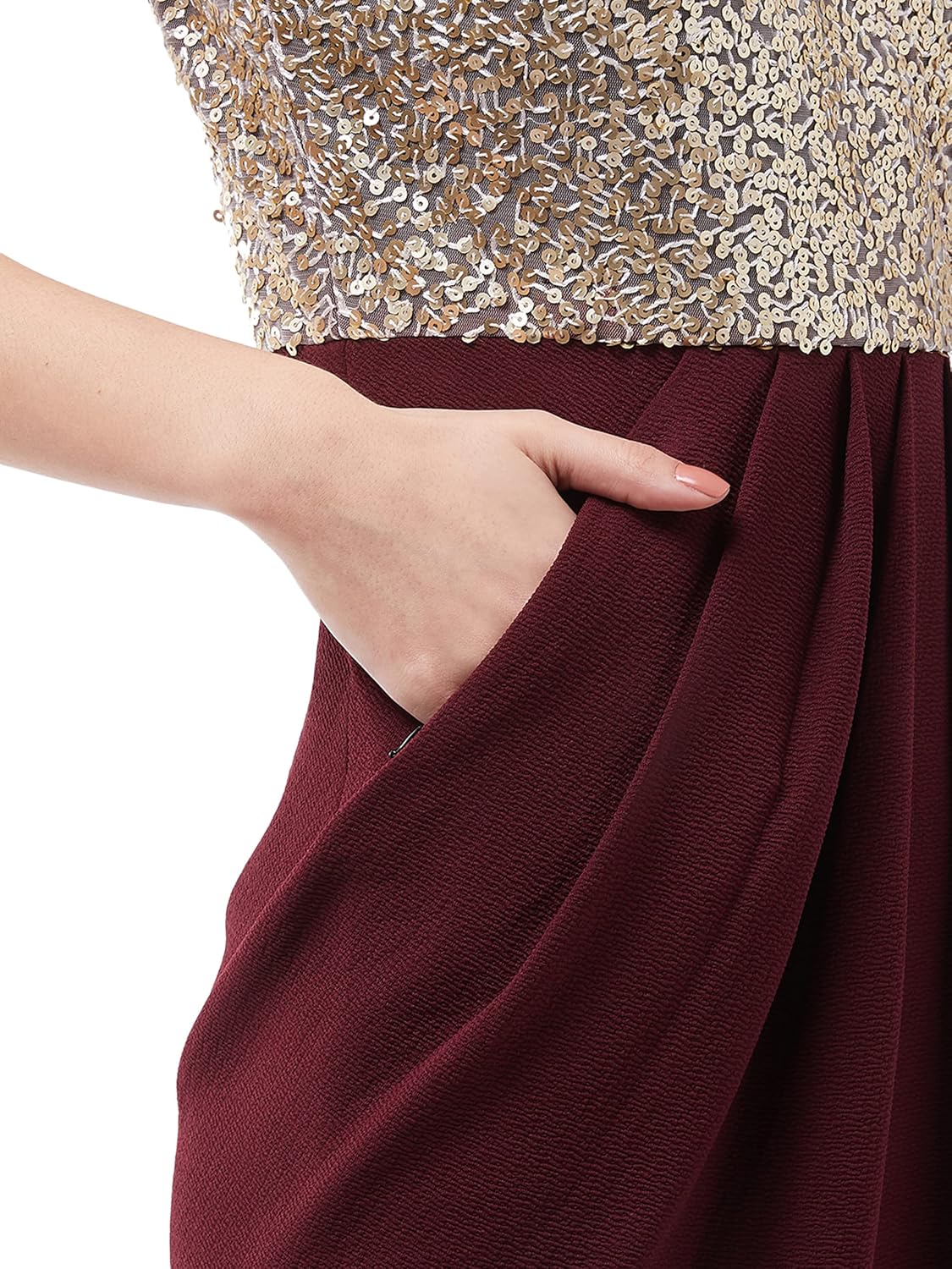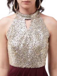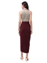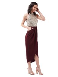 Miss Chase Women’s Wine Halter Neck Sleeveless Solid Embellished Midi Dress by VintaVool