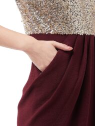 Very pretty looking dress. The fabric is okay. The sequins on the top can get uncomfortable on the skin. But overall it looks good