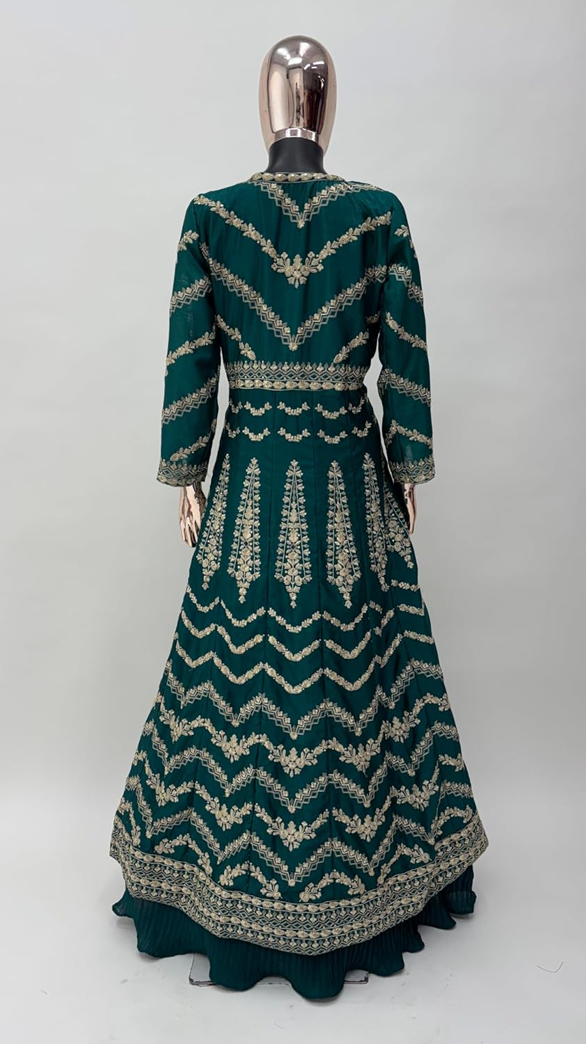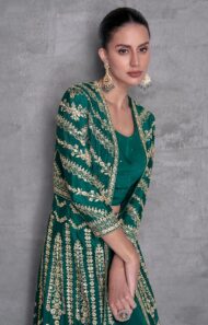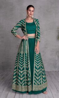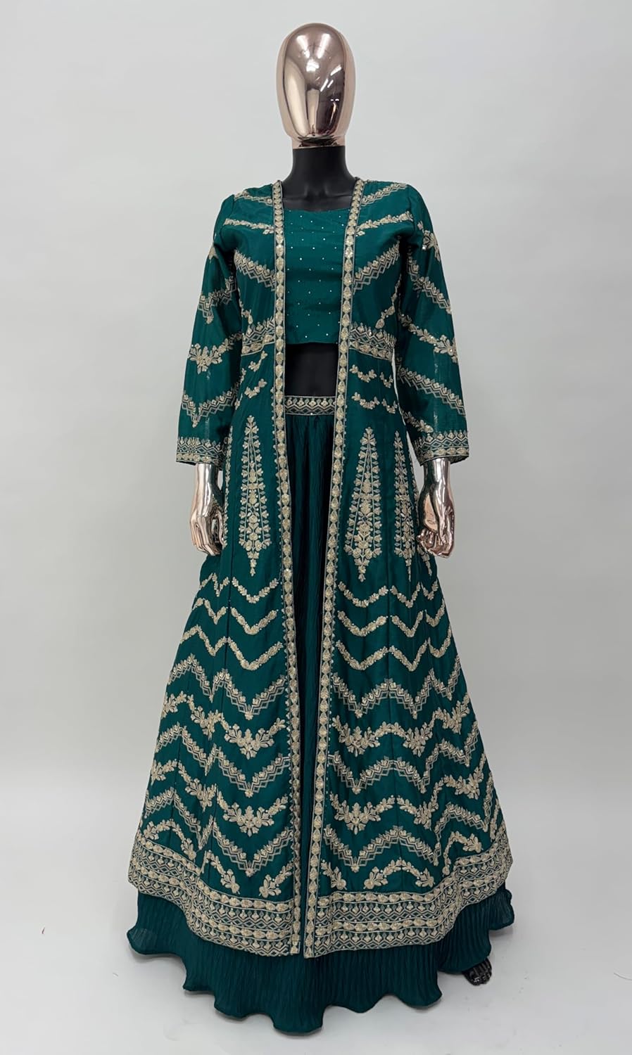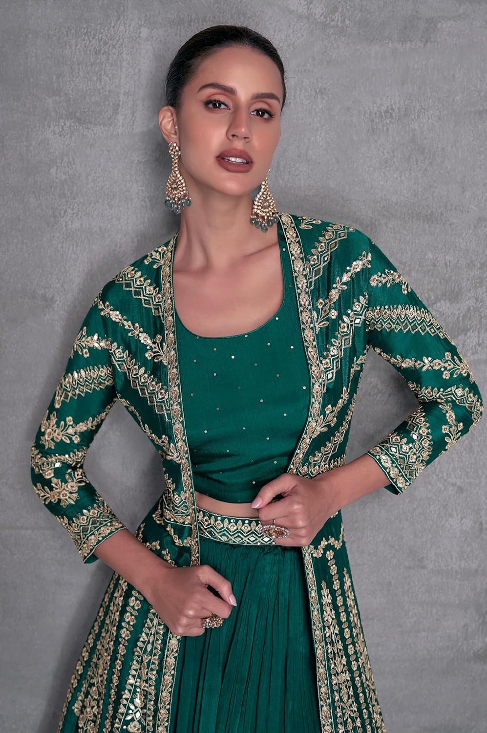 Miss Ethnik Women’s Green Chinon Stitched Top With Stitched Bottom Full Sleeve Embroidered Choli with Jacket (Lehenga Choli With Jacket) (ME-1196) by VintaVool