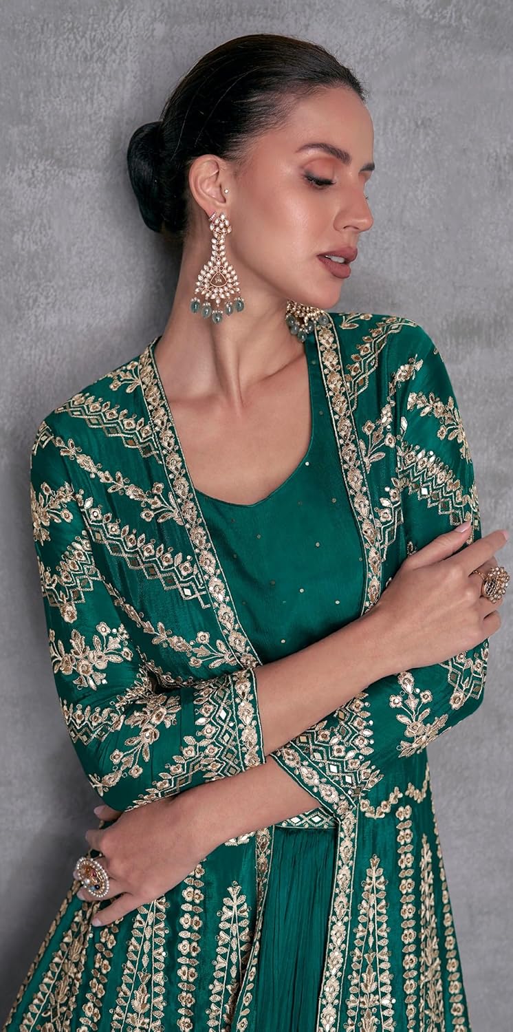 Choli Details : Color : Green, Choli Fabric : Chinon, Choli Stitching : Stitched, Choli Work : Embellished, Choli Length : 15 Inches , Product Type : Lehenga Choli With Jacket Jacket Details : Jacket Fabric : Chinon Jacket Work : Embroidered Jacket Length : 58 Bottom Details : Bottom Fabric : Chinon, Bottom Inner : Santoon, Bottom Stitching Type : Stitched, Bottom Length : 43 Inch, Bottom Waist : 42 Inch