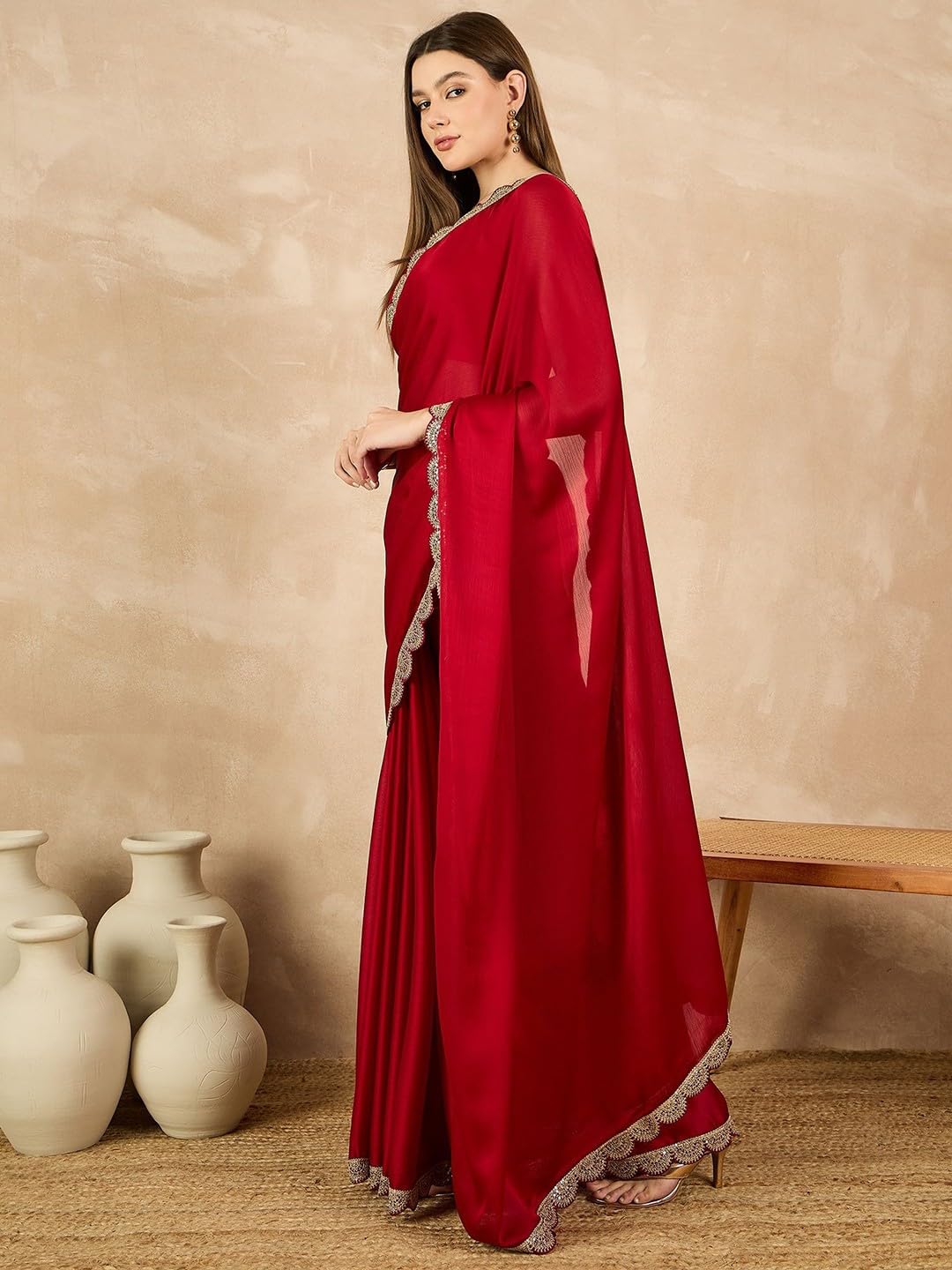 RAJESHWAR FASHION WITH RF Women’s Satin Chiffon Sequence Scalloping Border Plain Saree, Traditional Wedding Sarees For Women With Unstitched Blouse Piece by VintaVool