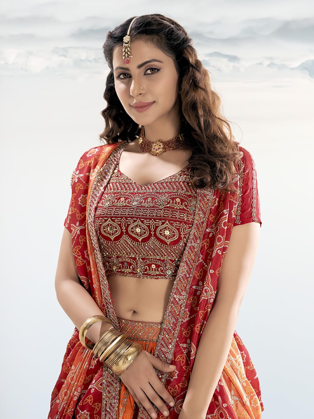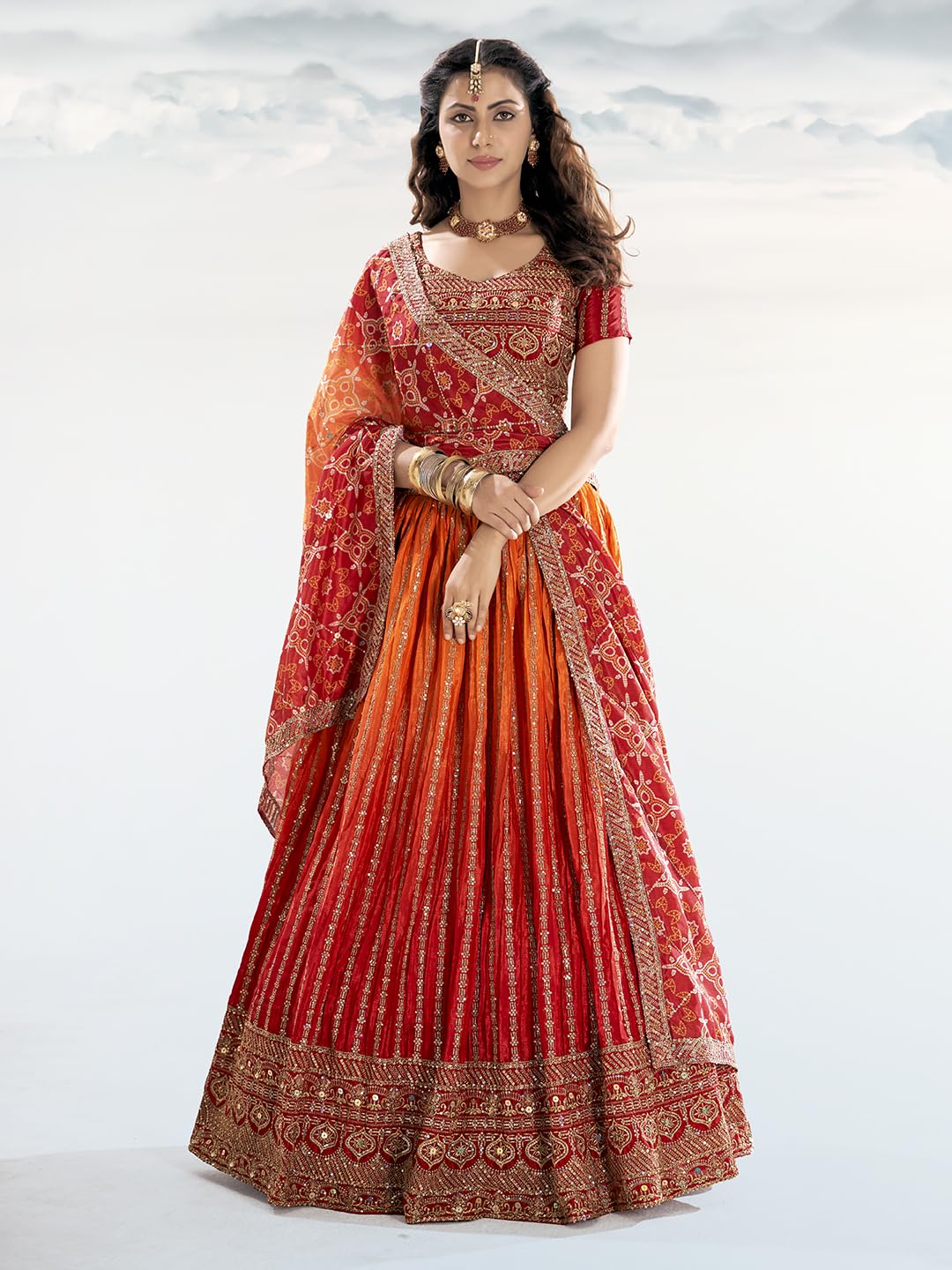 This beautiful semi-stitched lehenga choli features an elegant two-tone design, perfect for any festive or wedding occasion. With a waist size of up to 43 inches and a length of 43 inches, this outfit is tailored to provide a flattering fit. The lehenga boasts an impressive 3.5-meter flare, giving it a regal and voluminous look.