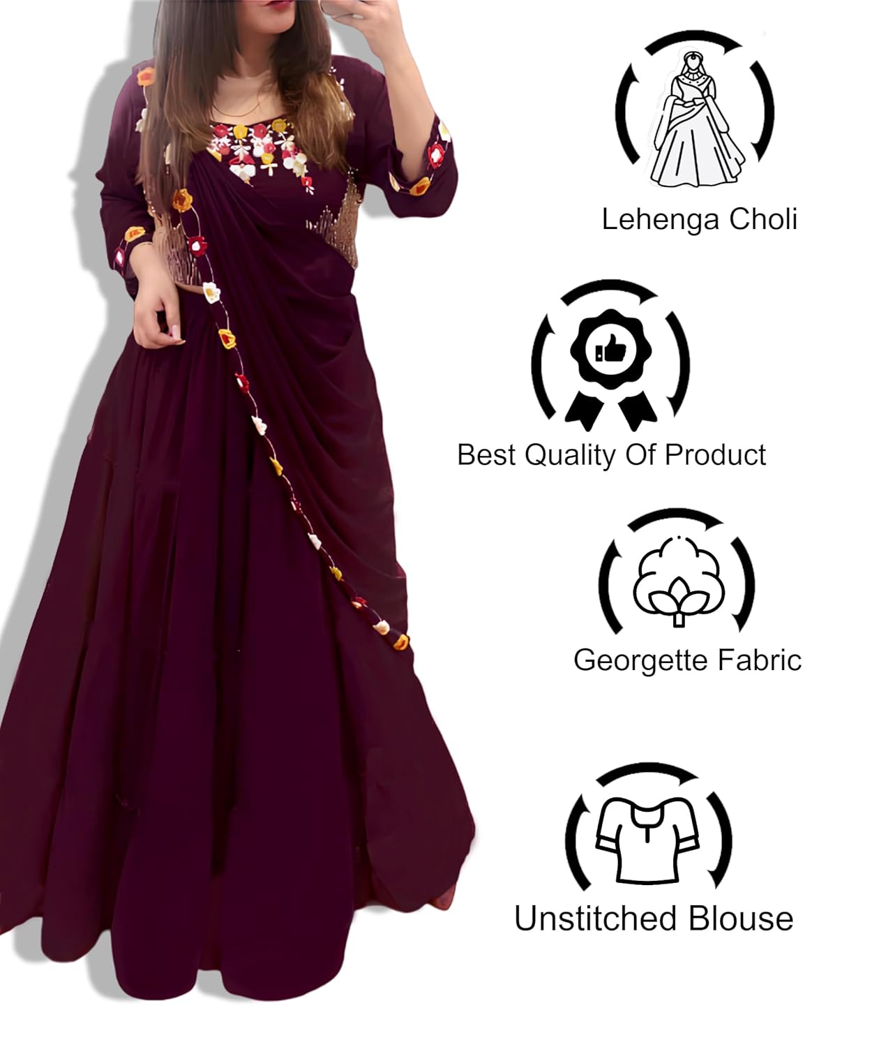 Made from high-quality material, Women’s Embroidered Semi-stitched Lehenga, Choli, and Dupatta Set offer comfort. So, the lehenga and georgette dupatta will keep you relaxed and allow easy management.