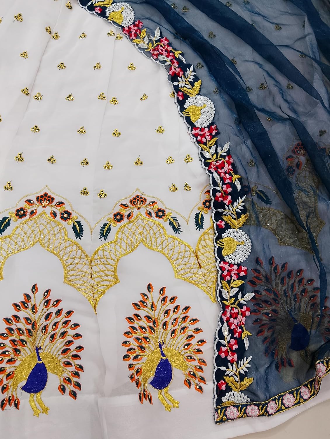 This beautiful babydoll bridal lehenga set is the perfect choice for your wedding day. Crafted from fine white fabric, it features an elegant peacock lehenga with delicate embroidery along the borders that will catch everyone’s eye. The blouse matches the lehenga perfectly with its own eye-catching peacock embroidery. Complete the look with the trousers, cut in a comfortable and flowing style. Wear this set for a stand-out moment as you say your vows. Suitable for all body types, it has an airy feel that is great for warm weather. The high quality fabrics and intricate embroidery make this lehenga set a heirloom piece you will treasure for years to come.
