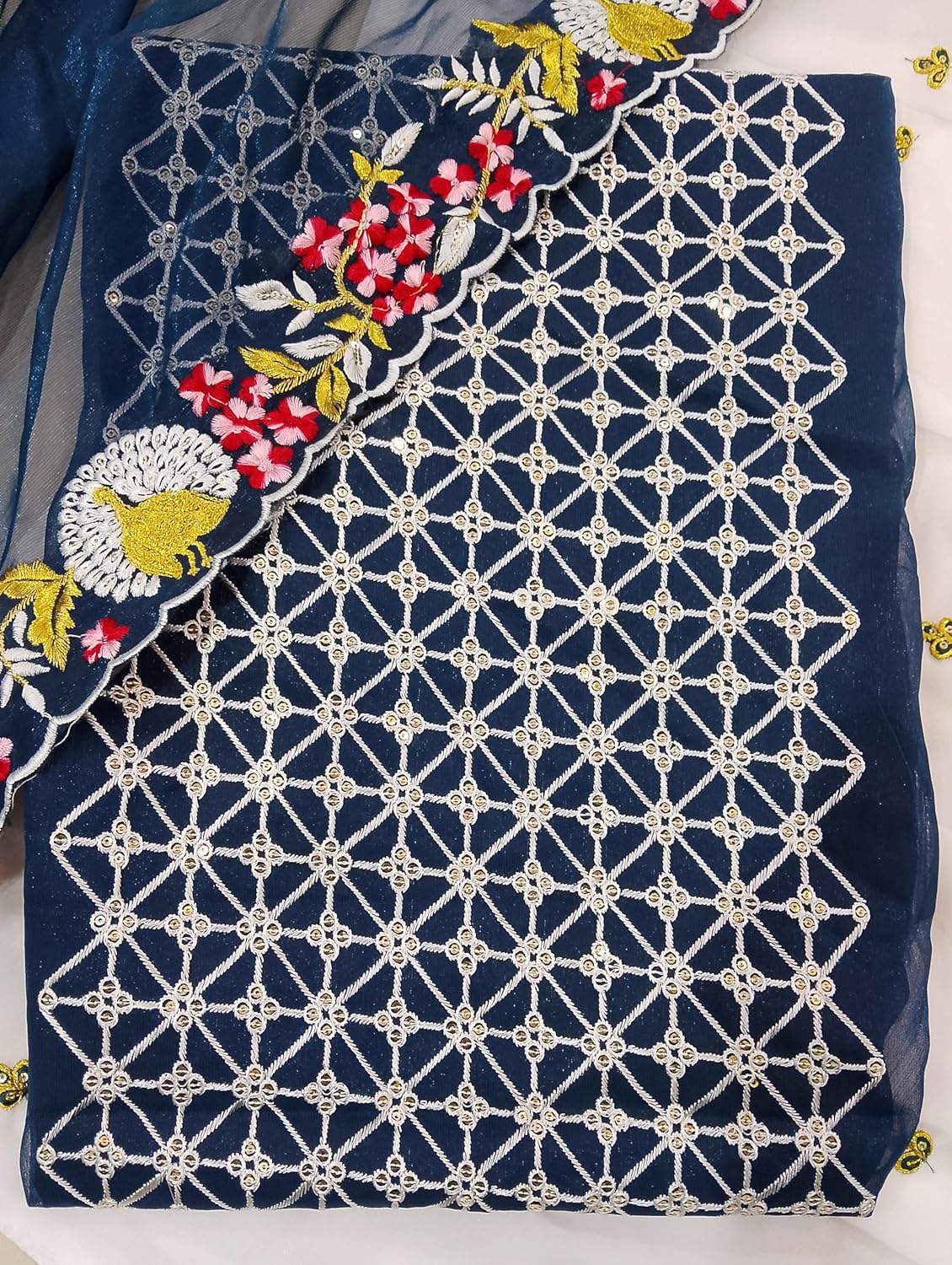 Awesome product.Satin silk material. Embroidery was as it shown in pic.Blouse and dupatta material aur embroidery as shown as pics.