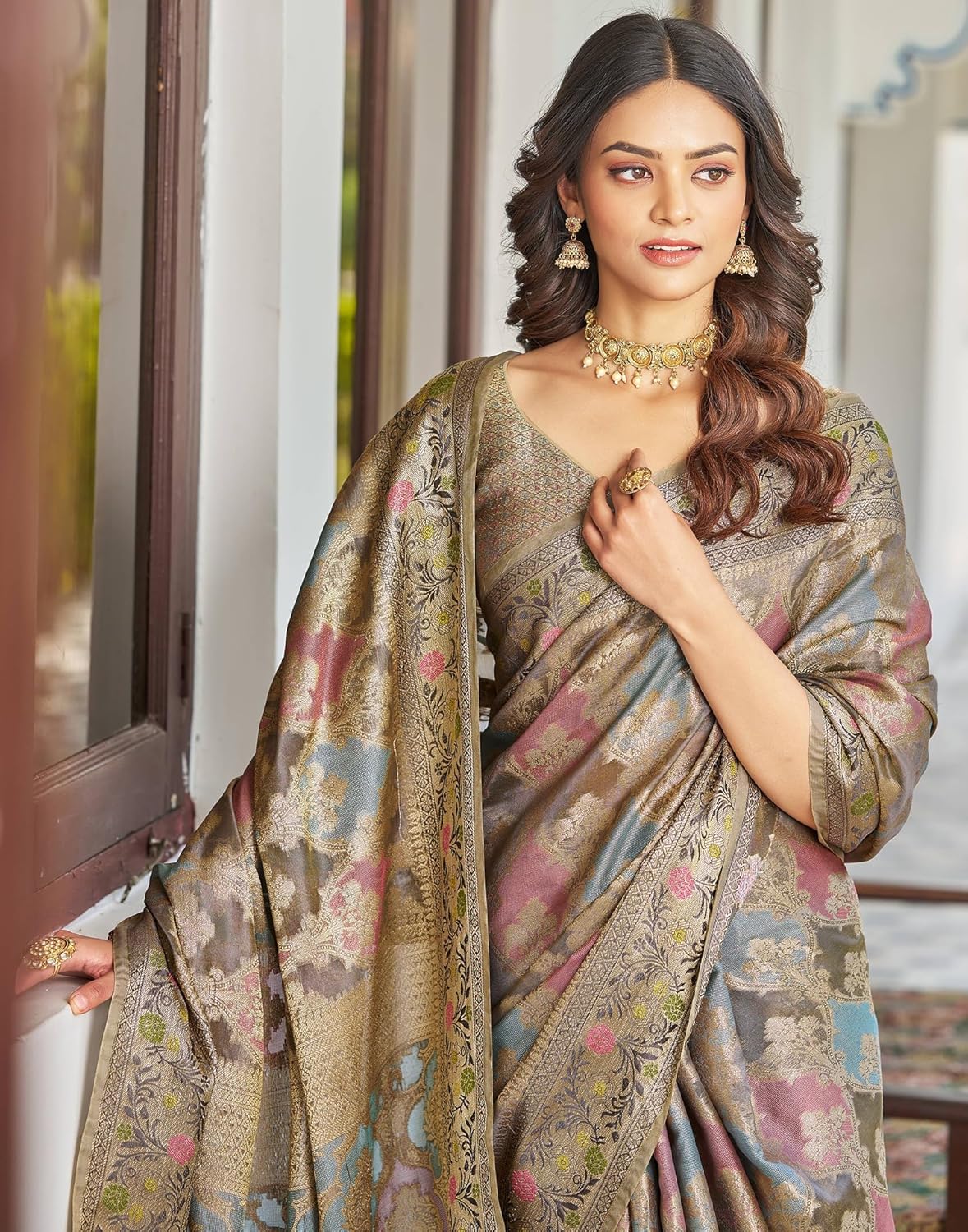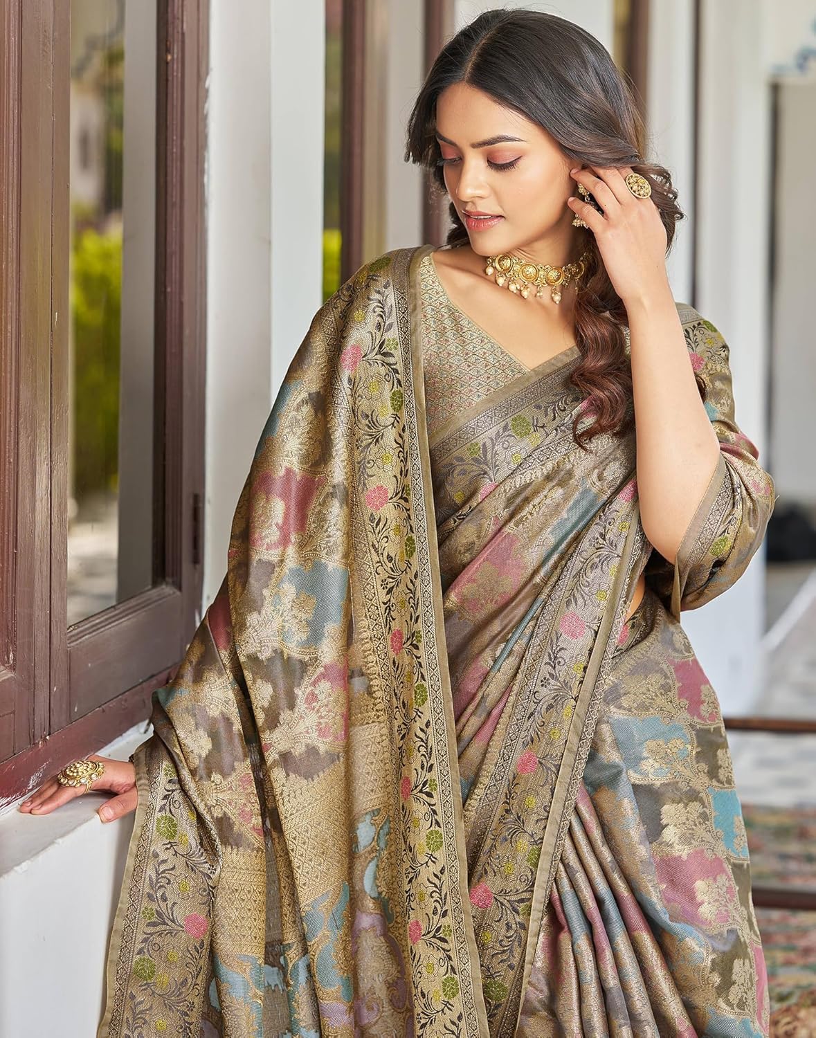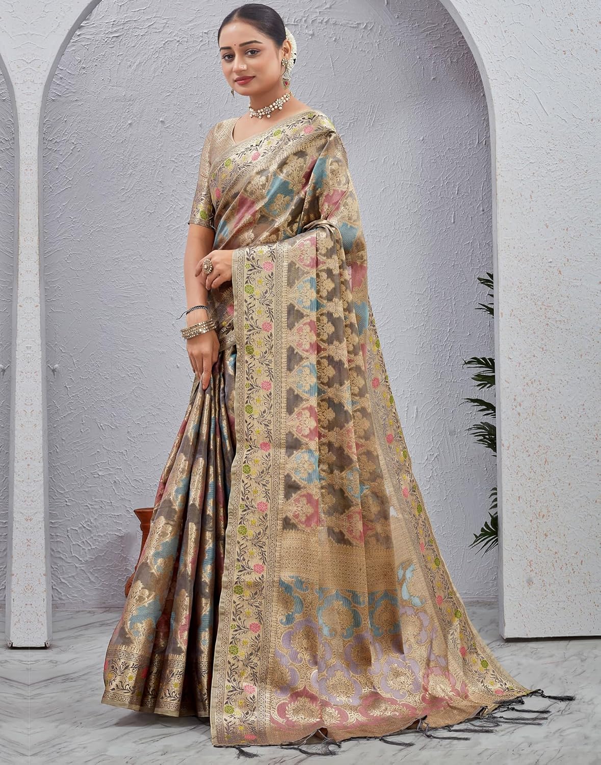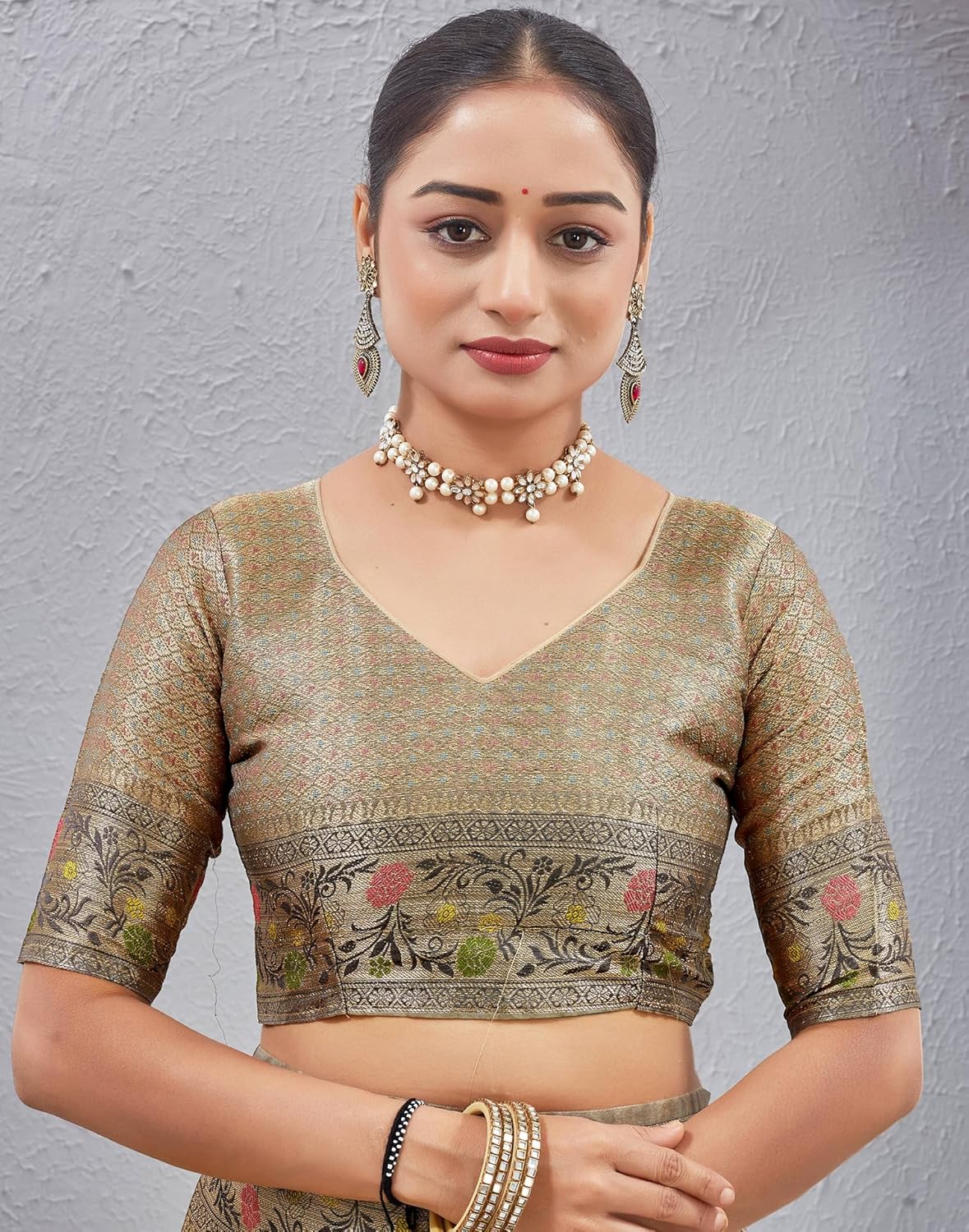 SIRIL Women’s Banarasi Silk Jacquard Zari Work Saree With Unstitched Blouse Piece by VintaVool