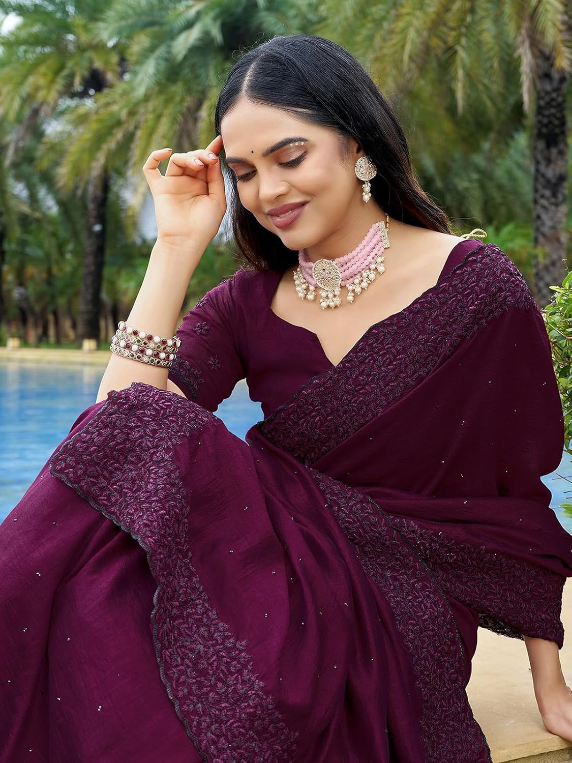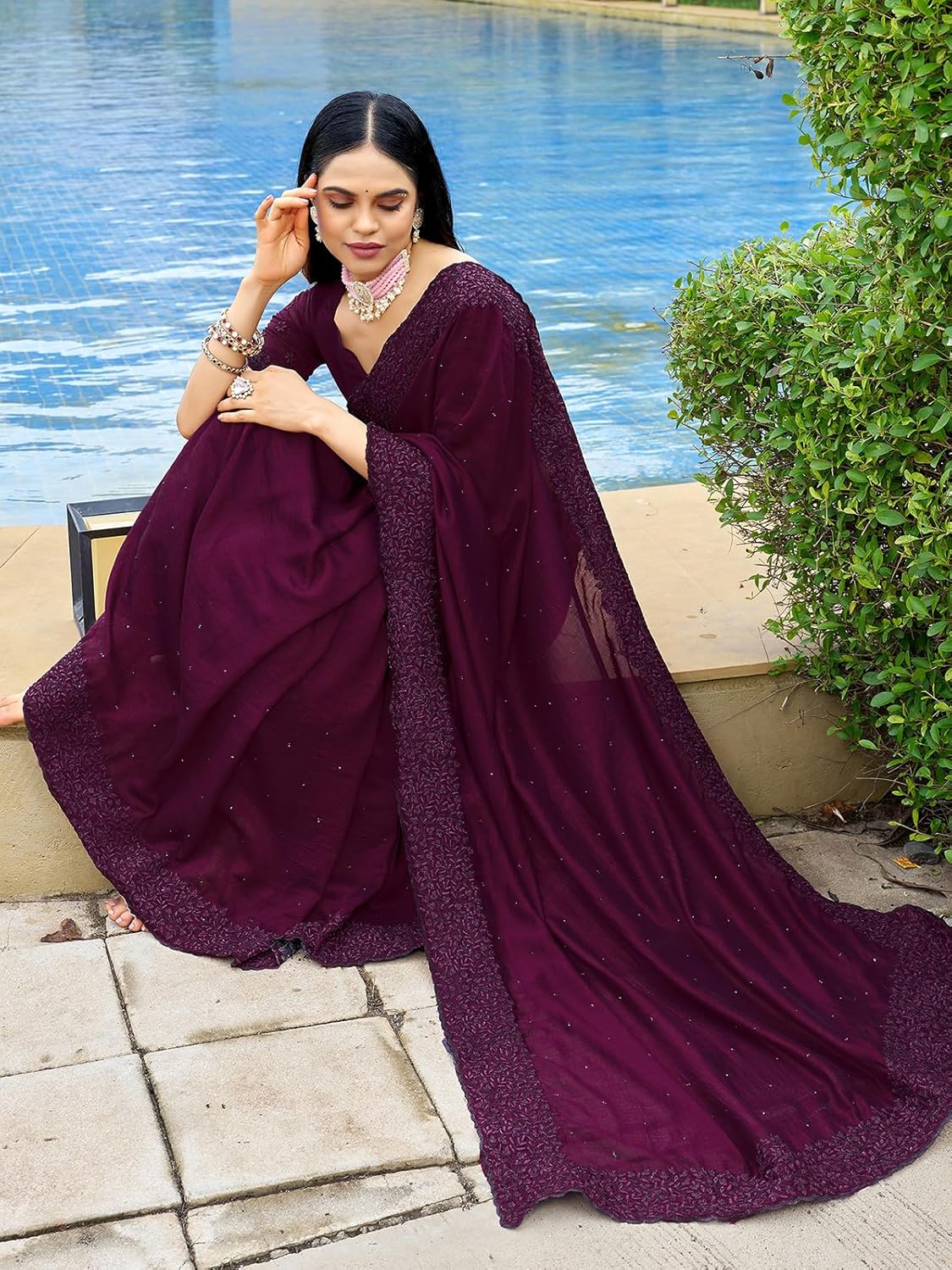 9 reviews for SIRIL Women’s Embroidery Stone Work Vichitra Silk Saree with Unstitched Blouse Piece by VintaVool