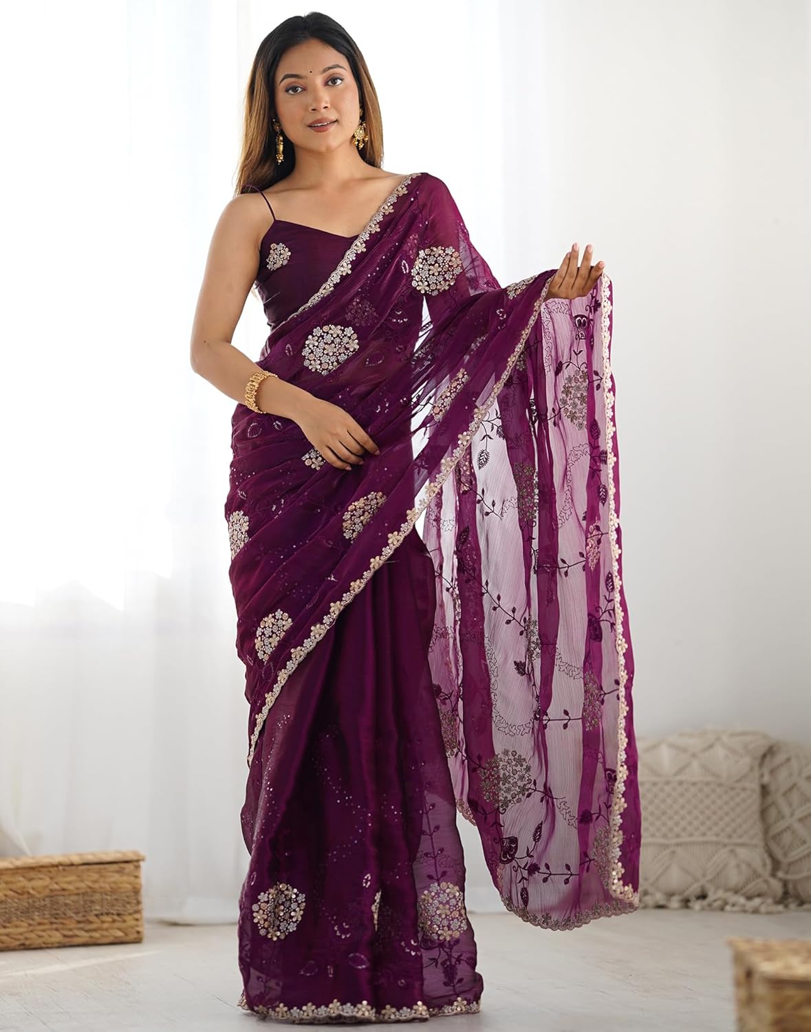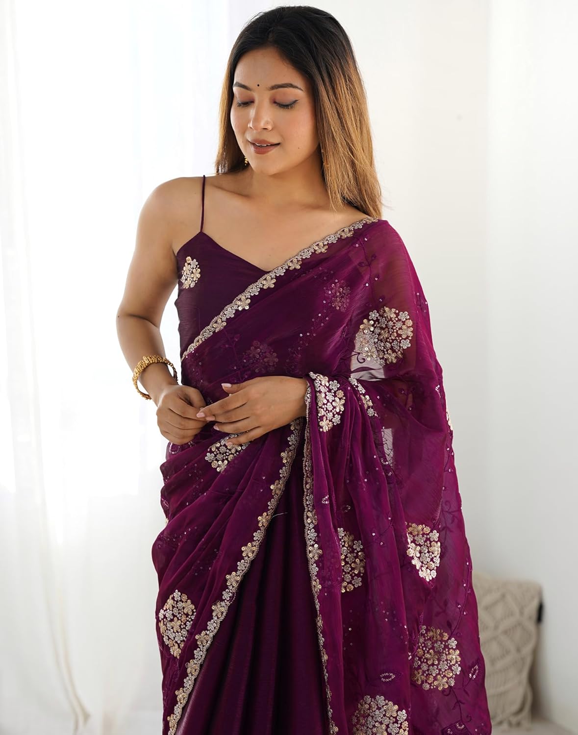 SIRIL Women’s Shimmer Chiffon Sequence Embroidery Saree With Unstitched Blouse Piece for Wedding and Parties by VintaVool