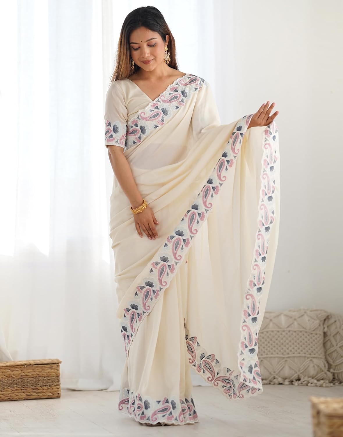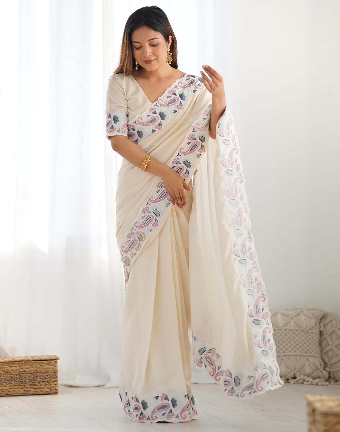 SIRIL Women’s Silk Blend Embroidery Scalloped Border Saree With Unstitched Blouse Piece for Wedding and Parties by VintaVool