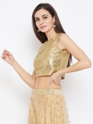 Every woman needs Gold tops to dress up her outfits. Studiorasa brings you a range of gold tops with sequins, brocades and nets. Outshine everyone at the next party with this range of tops. Wear them with skirts, sharara’s, lehenga skirt and as a saree blouse.