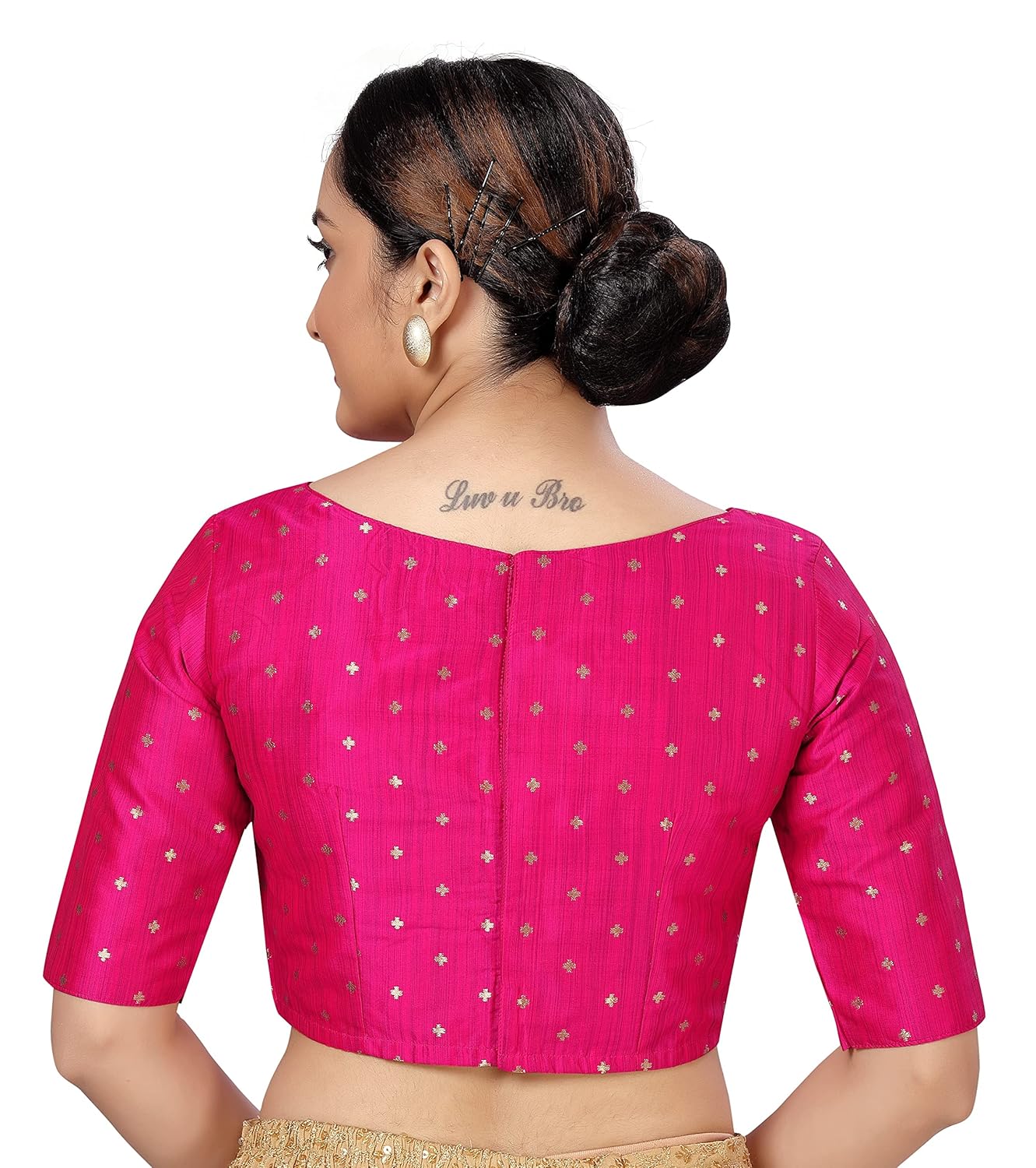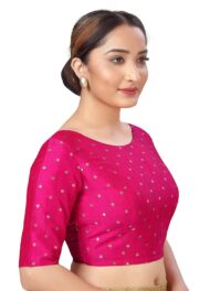 A beautiful poly silk brocade blouse. The brocade used is a very superior quality from Benaras. It is lined with pure cotton for extra comfort. It opens from the back and has elbow length sleeves ( 10′ to 11″). The length of this blouse is 15″. There are ample margins and allowances inside to make the blouse bigger by a few inches if required. It has a boat neck and is lined with pure cotton for extra comfort. This brocade has golden thread woven dots all along. You can team it up with any contrast coloured saree and you are good to go to a wedding in it. Also since it opens from the back you can team it up with a golden skirt and make it into a lehenga set. Golden skirt is also available in Studio Shringaar catalogue.