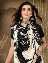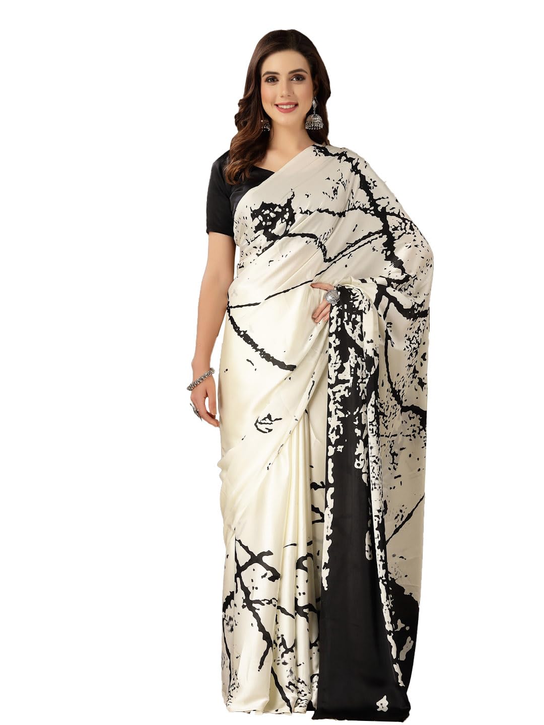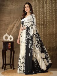 Cream and black colour Tie & Dye print saree. Modern era soft satin fabric saree. Has soft skin friendly fabric. Beautiful saree to be wear from a classy get together to party wear. The Saree comes with an unstitched blouse piece. The blouse worn by the model might be for modelling purpose only. Check the image of unstitch blouse piece to understand how the actual blouse looks like.