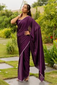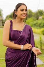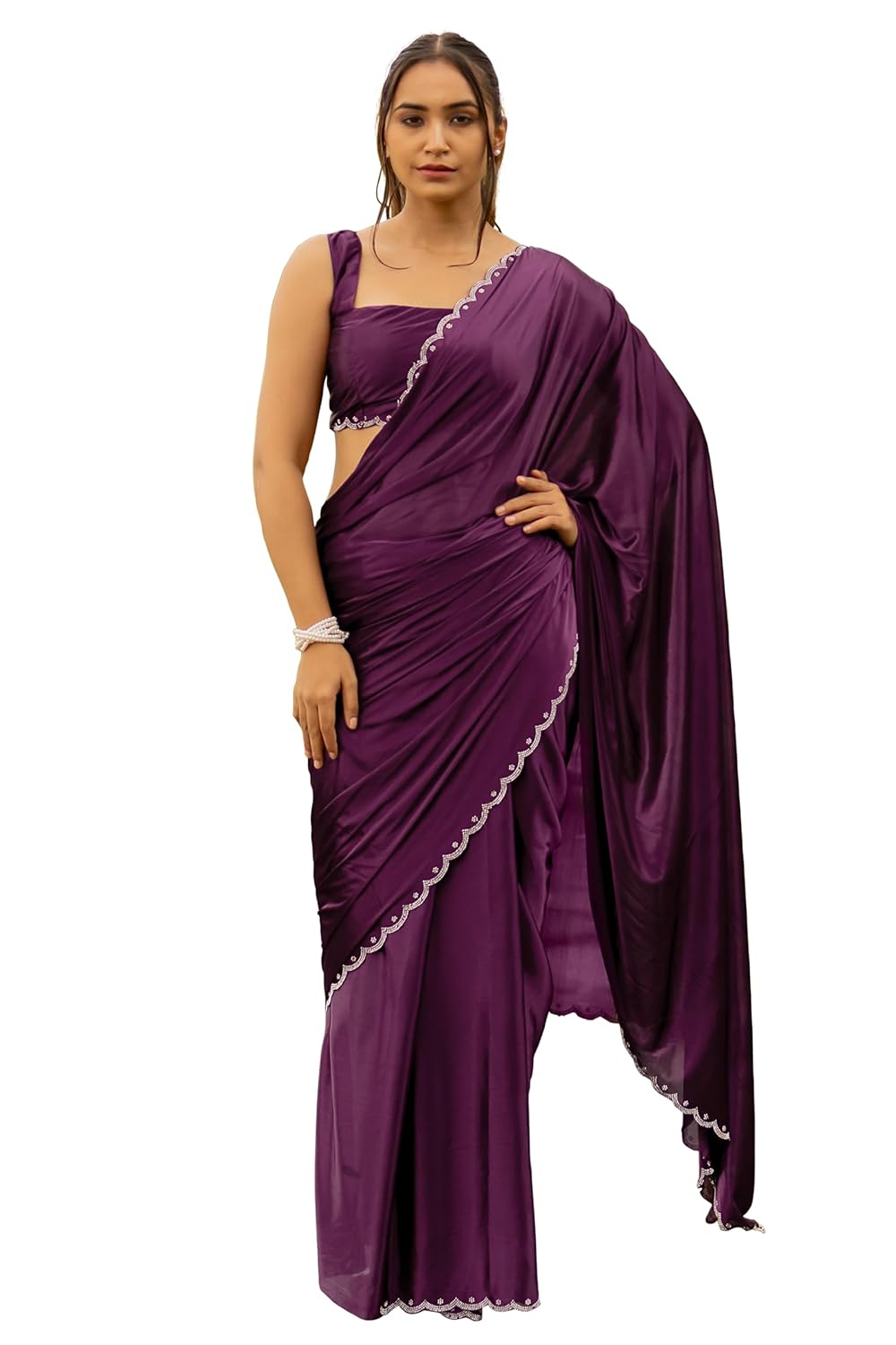 The SHUBHAM Women’s Silk Stone Work Saree adds a touch of elegance to your festive wardrobe. Crafted from luxurious soft satin fabric, this wine-colored saree is adorned with exquisite stone/diamond border work, elevating its charm. The scalloped cut work border further elevates its traditional appeal, while the sleek satin material provides comfort and style. Ideal for various occasions like parties, receptions, weddings, and formal gatherings, this saree promises a timeless, graceful look that is sure to leave a lasting impression.