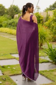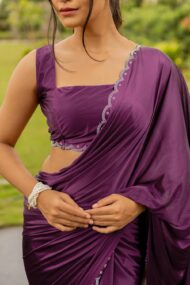 The saree comes with a matching wine-colored blouse piece in soft satin, which can be tailored to your preferred size and fit. It complements the saree beautifully, creating a seamless, chic look.