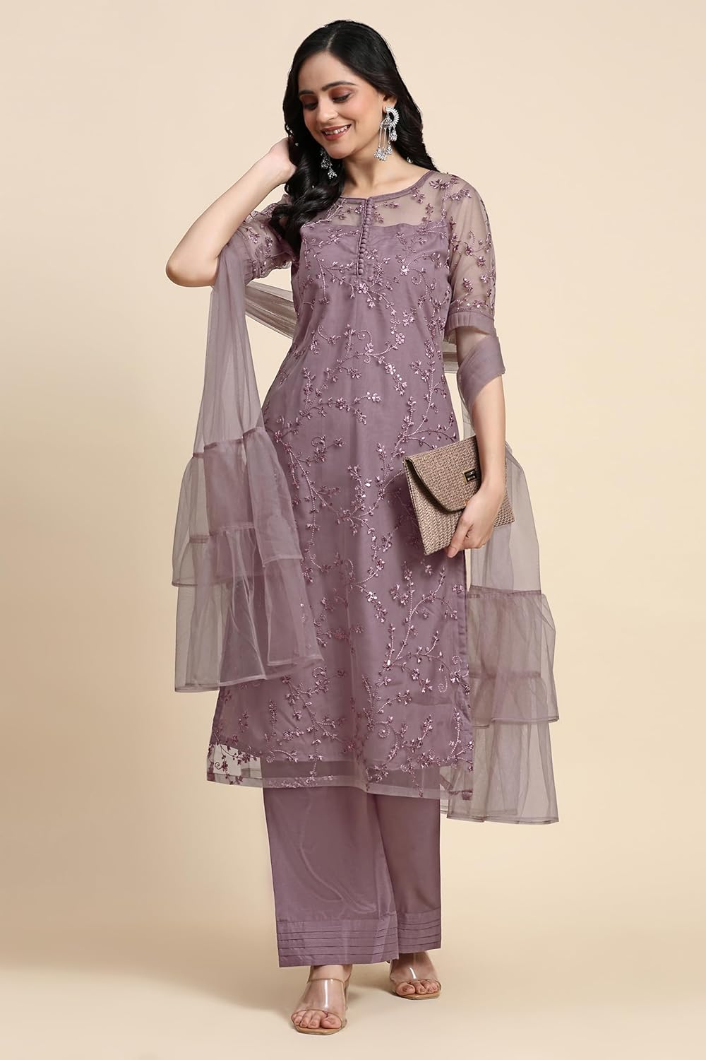 TRENDMALLS Women’s Net Embroidery Sequence Work Kurta Palazzo Set with Dupatta Kurta Set for Women by VintaVool