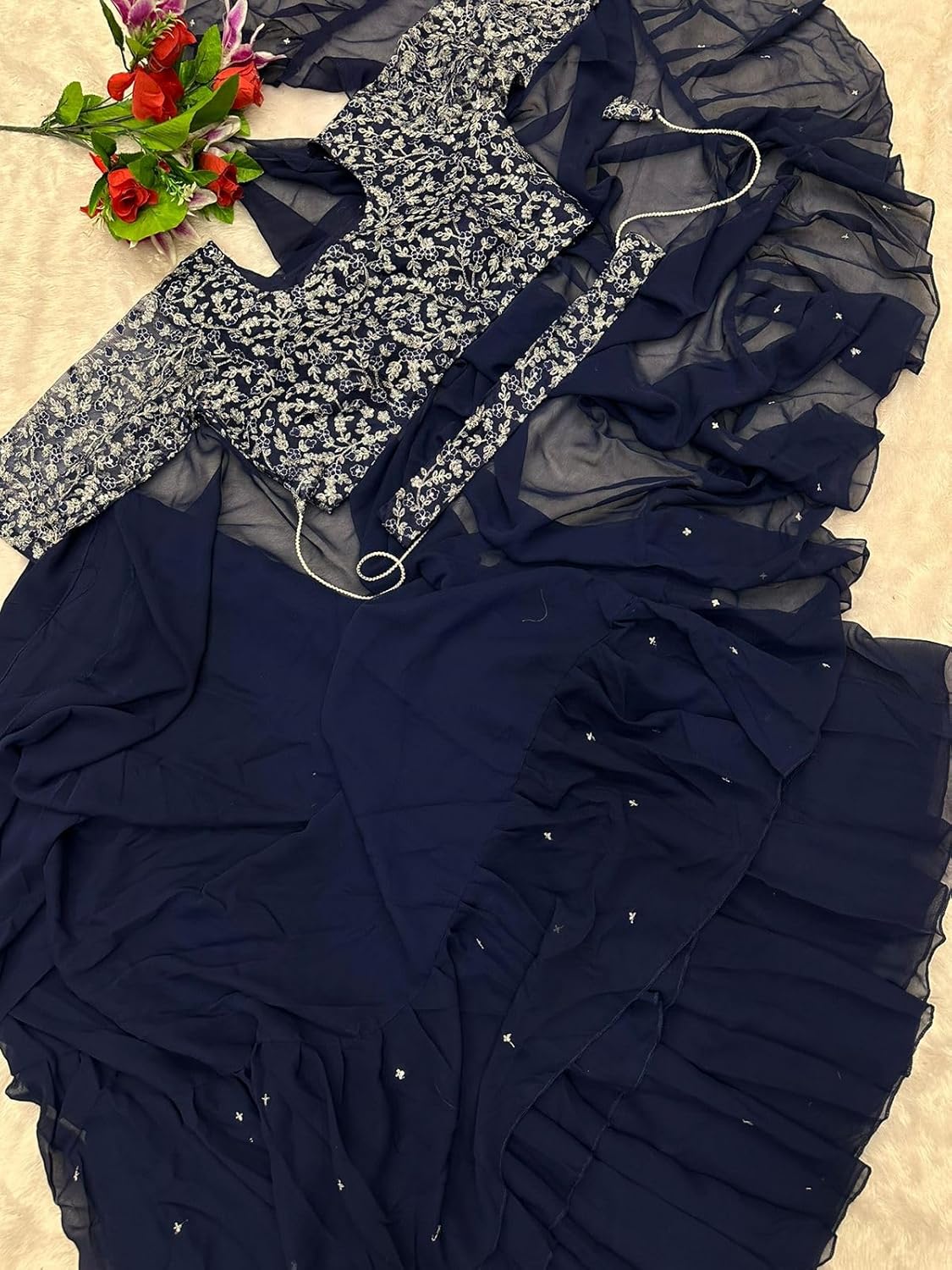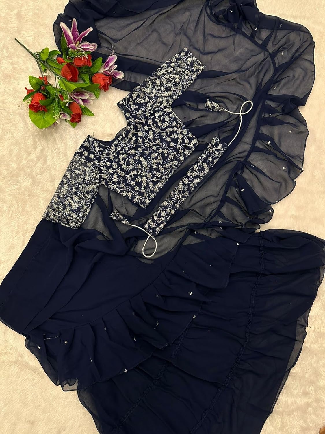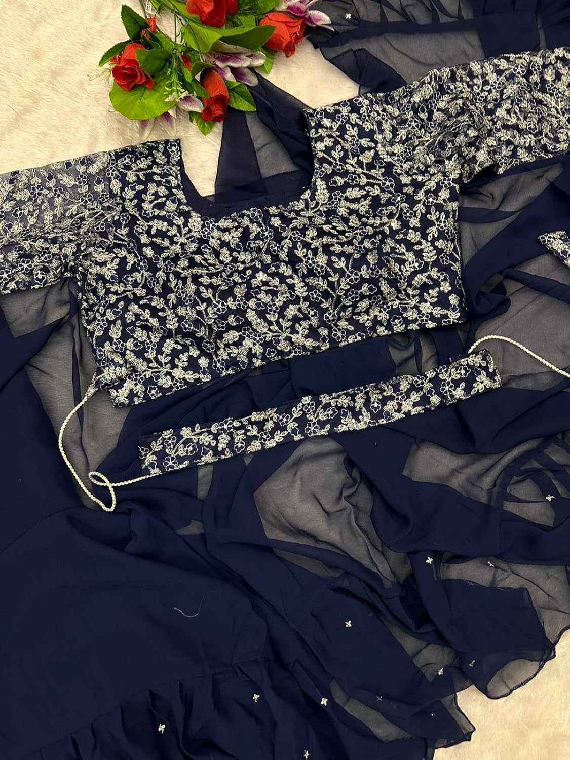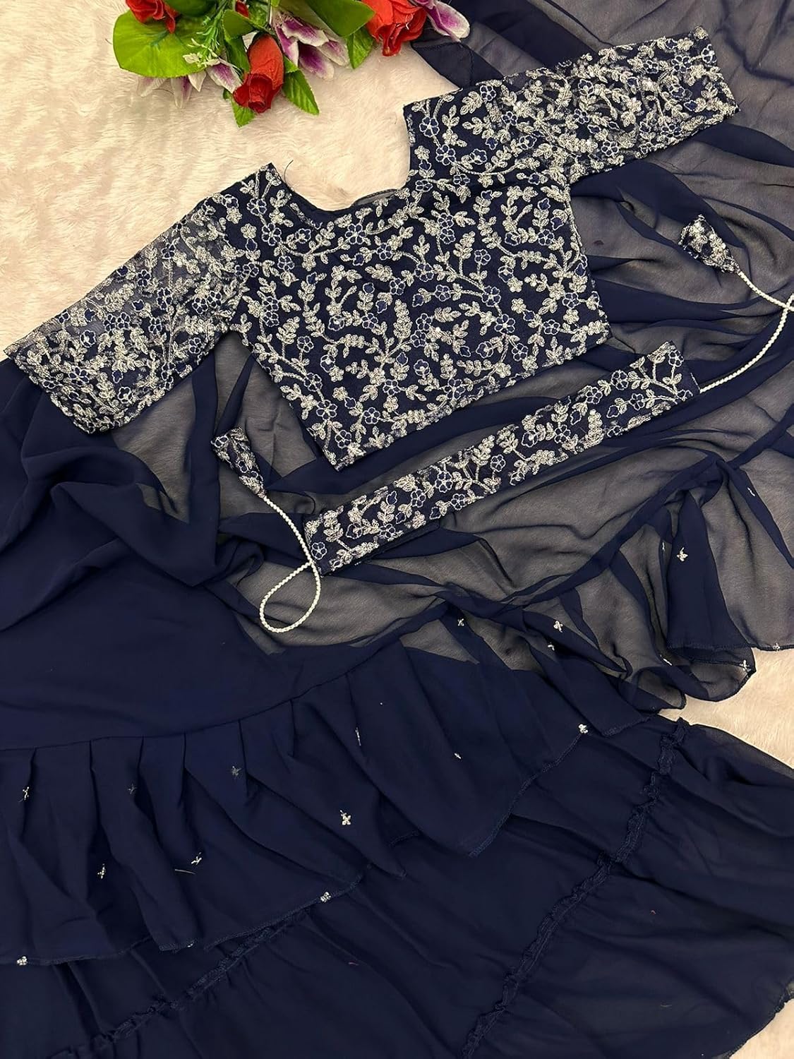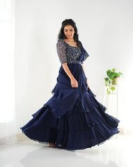 What a stunning description! Here’s a breakdown of the product: Product Name: Ready To Wear Lehenga Saree & Belt Set Fabric: Apple Organza Silk Fabric Style: Bollywood Style Description: This is a fully stitched lehenga saree set that’s ready to wear. The lehenga is made of apple organza silk fabric, which is a luxurious and lightweight fabric. The fabric has a beautiful embroidered sequin work that adds a touch of glamour to the overall design. The lehenga is designed in a Bollywood style, which means it’s perfect for special occasions like weddings, parties, or festivals. The set comes with a matching belt that adds a finishing touch to the overall look. Key Features: Fully stitched and ready to wear Apple organza silk fabric for a luxurious feel Embroidered sequin work for added glamour Bollywood style design for special occasions Matching belt included Perfect For: Weddings Parties Festivals Special occasions